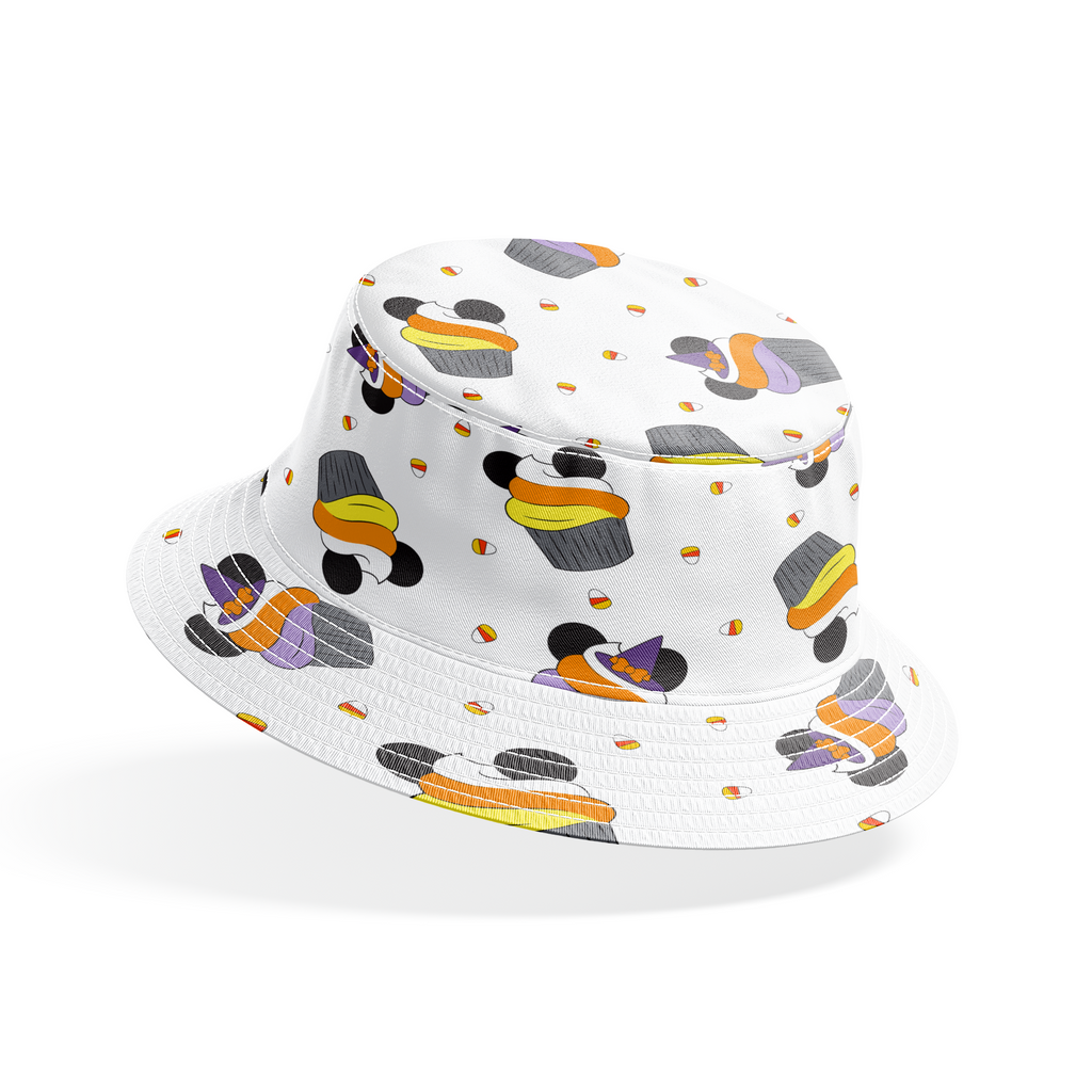 Whimsical Disney Mickey Mouse-inspired cupcake pattern with candy corn accents in orange, purple and black. Perfect for Halloween celebrations or Disney-themed baking parties.