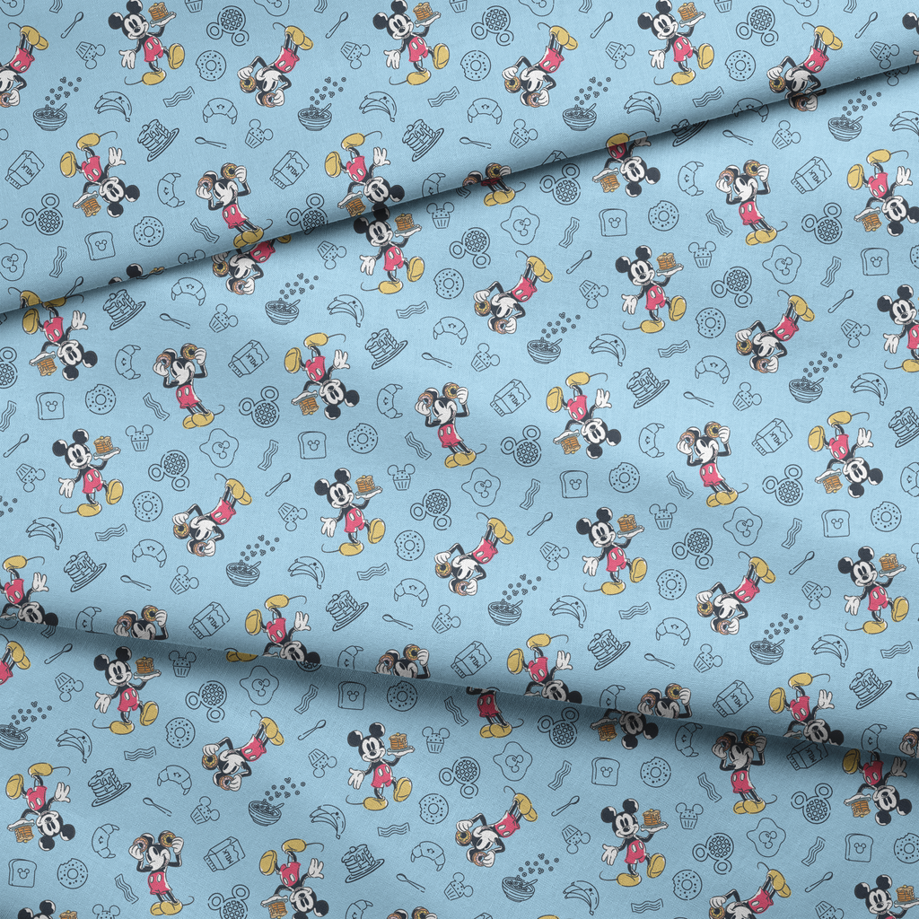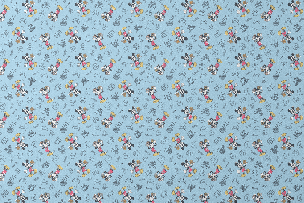 Disney Mickey Mouse as a chef cooking breakfast on a light blue background with kitchen utensils and food items like waffles, milk and donuts. Perfect for crafting projects.