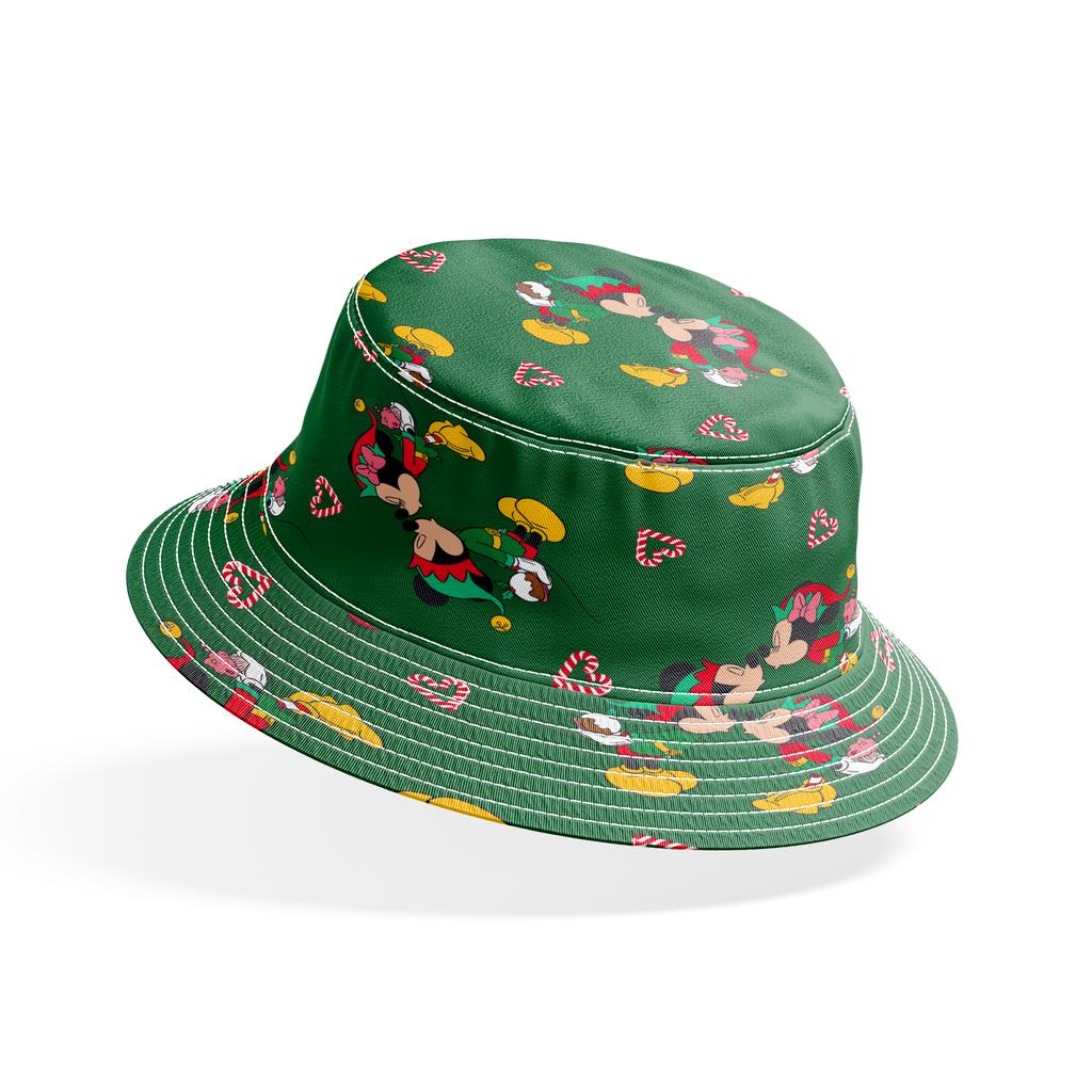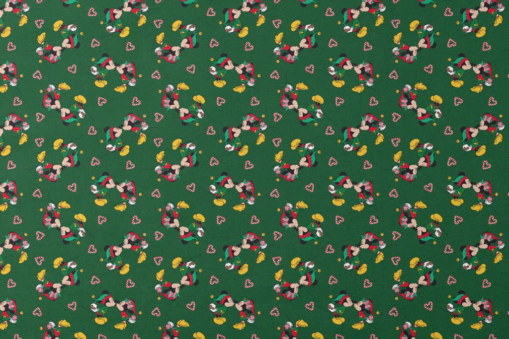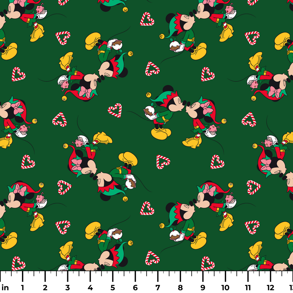 Festive Christmas Disney Mickey Mouse & Minnie Mouse pattern featuring candy canes on deep green background - perfect for seasonal crafts and decor.
