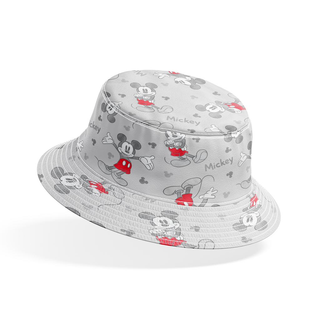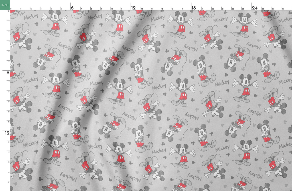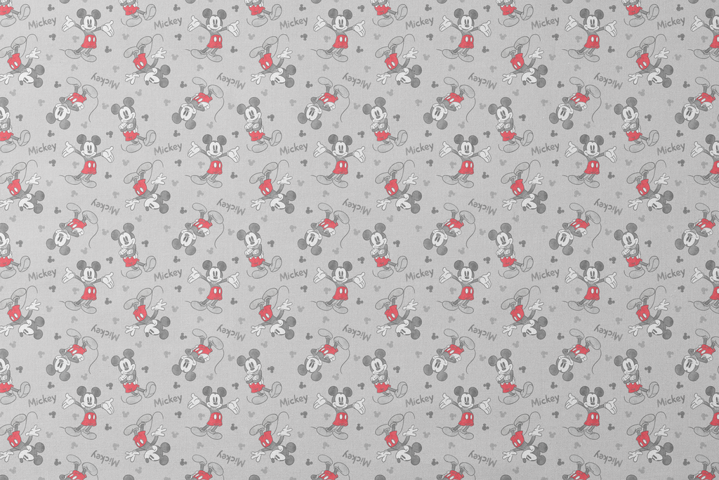 Classic Disney Mickey Mouse pattern featuring the iconic character in various poses with text of "Mickey" and floating silhouette heads on a gray background. Perfect for crafting projects.
