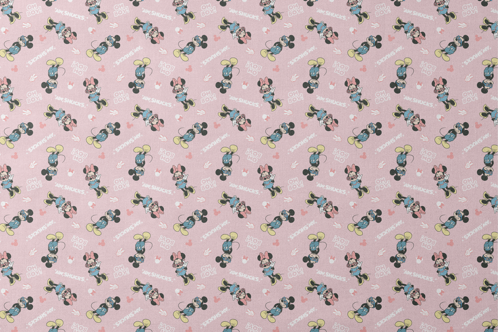Disney's iconic Mickey Mouse and Minnie Mouse in a whimsical pattern on soft pink. Classic cartoon poses with playful expressions and vintage-style text create a retro fan favorite for apparel and home decor.