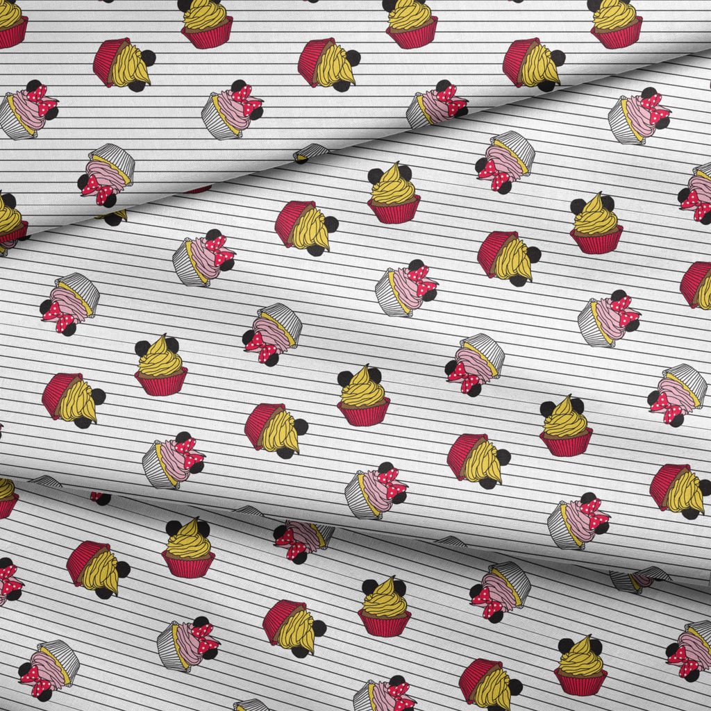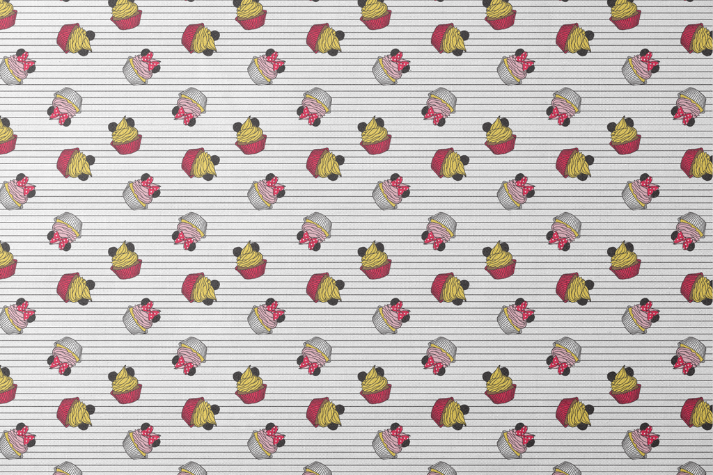 Adorable cupcake pattern with Mickey Mouse and Minnie Mouse inspired designs on a striped background. Perfect for baking enthusiasts and Disney fans who love sweet treats!