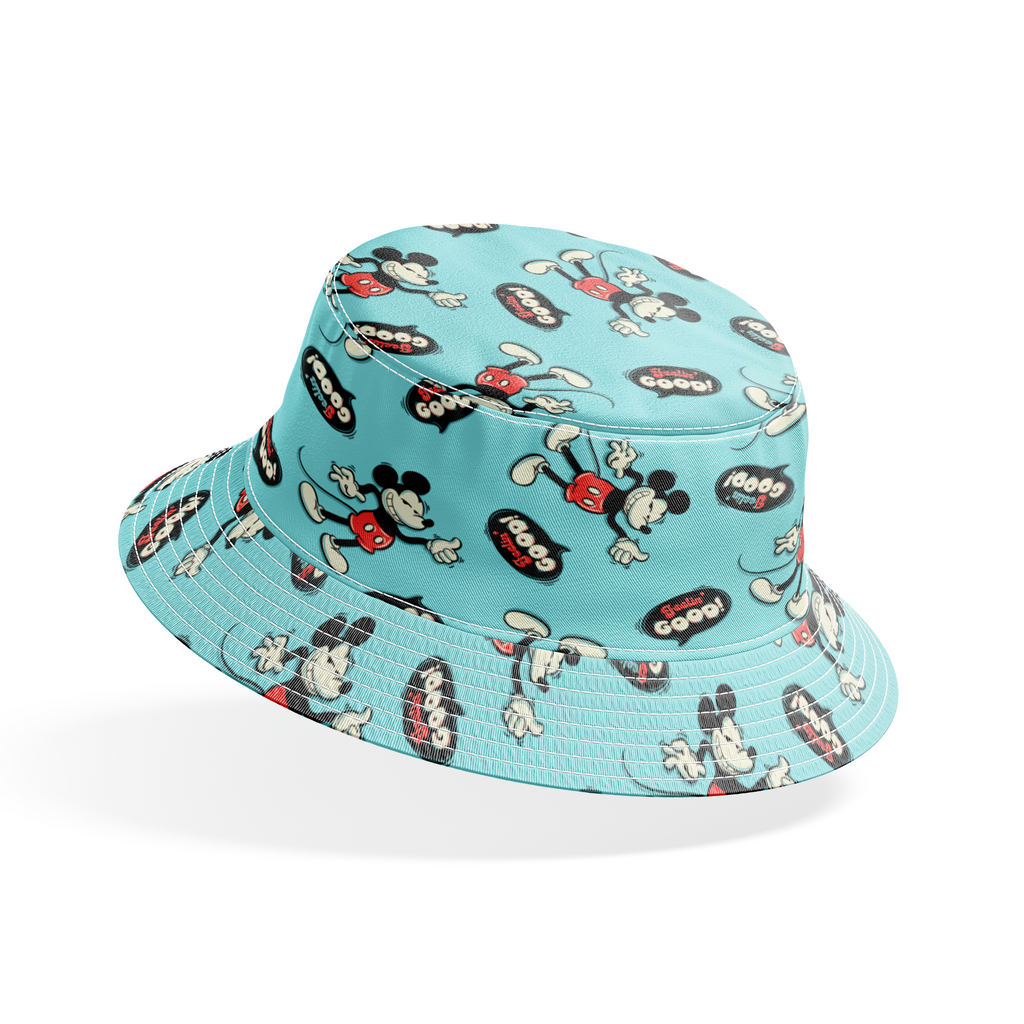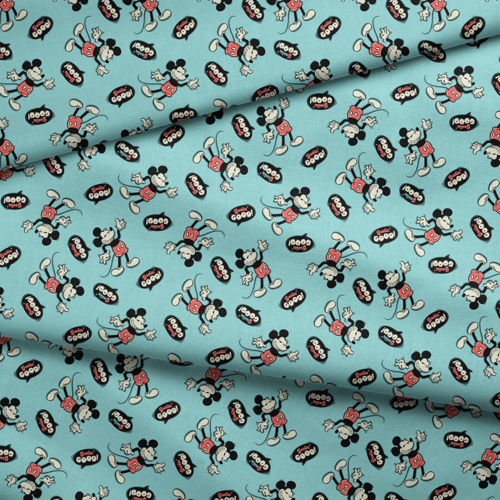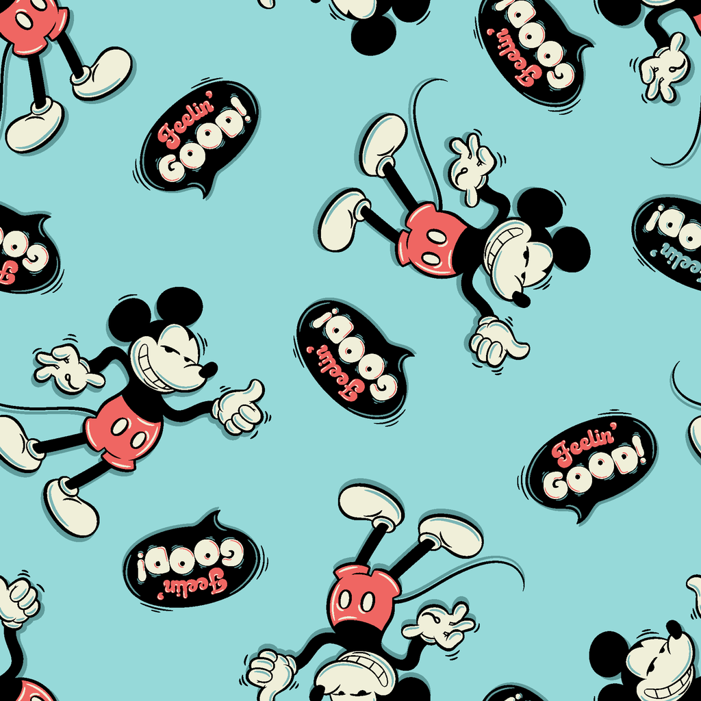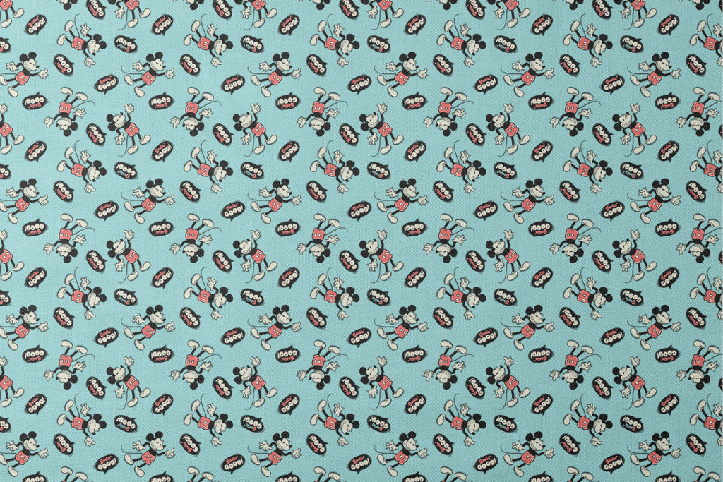 Adorable Disney Mickey Mouse pattern on a turquoise background with retro speech bubbles. This cheerful Disney design blends vintage cartoon styling with a playful pop-art aesthetic.