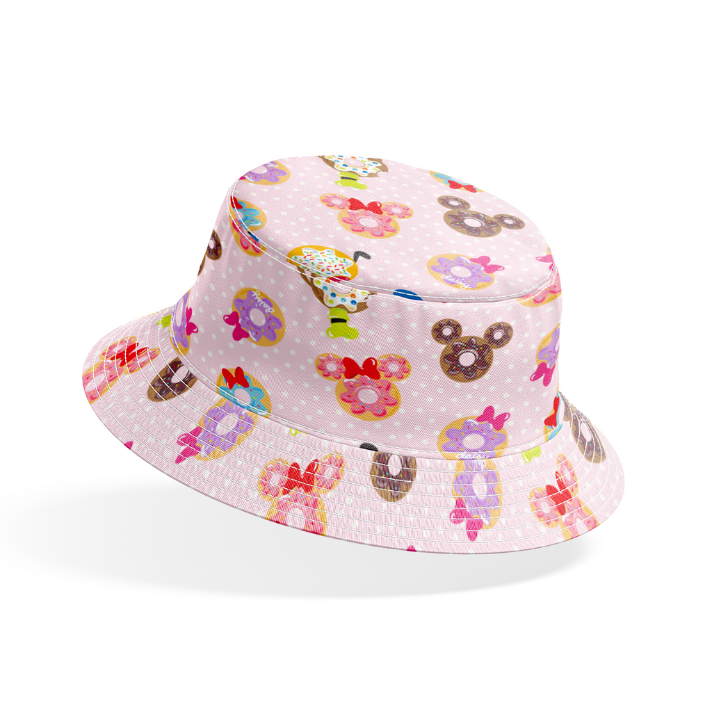 Whimsical Disney-inspired donut pattern featuring colorful treats with bows on a light pink polka dot background - perfect for sweet-themed home decor or children's apparel.