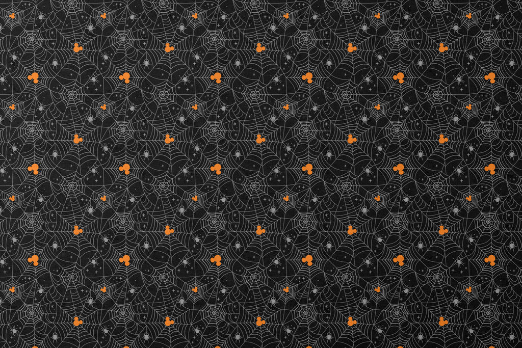Spooky Halloween spiderweb pattern with orange Disney Mickey Mouse heads and gray spiders on a black background, perfect for seasonal decor or gothic celebrations.