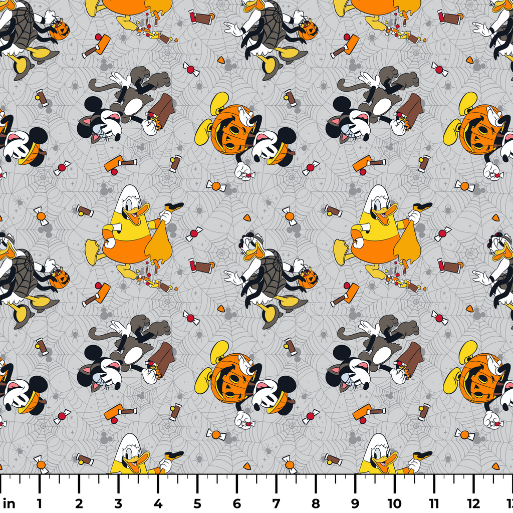 Iconic Disney characters scatter across a gray spiderweb pattern in this playful Halloween-themed fabric. Features Mickey Mouse, Minnie Mouse, Donald Duck and Pluto with candy corn and treats.