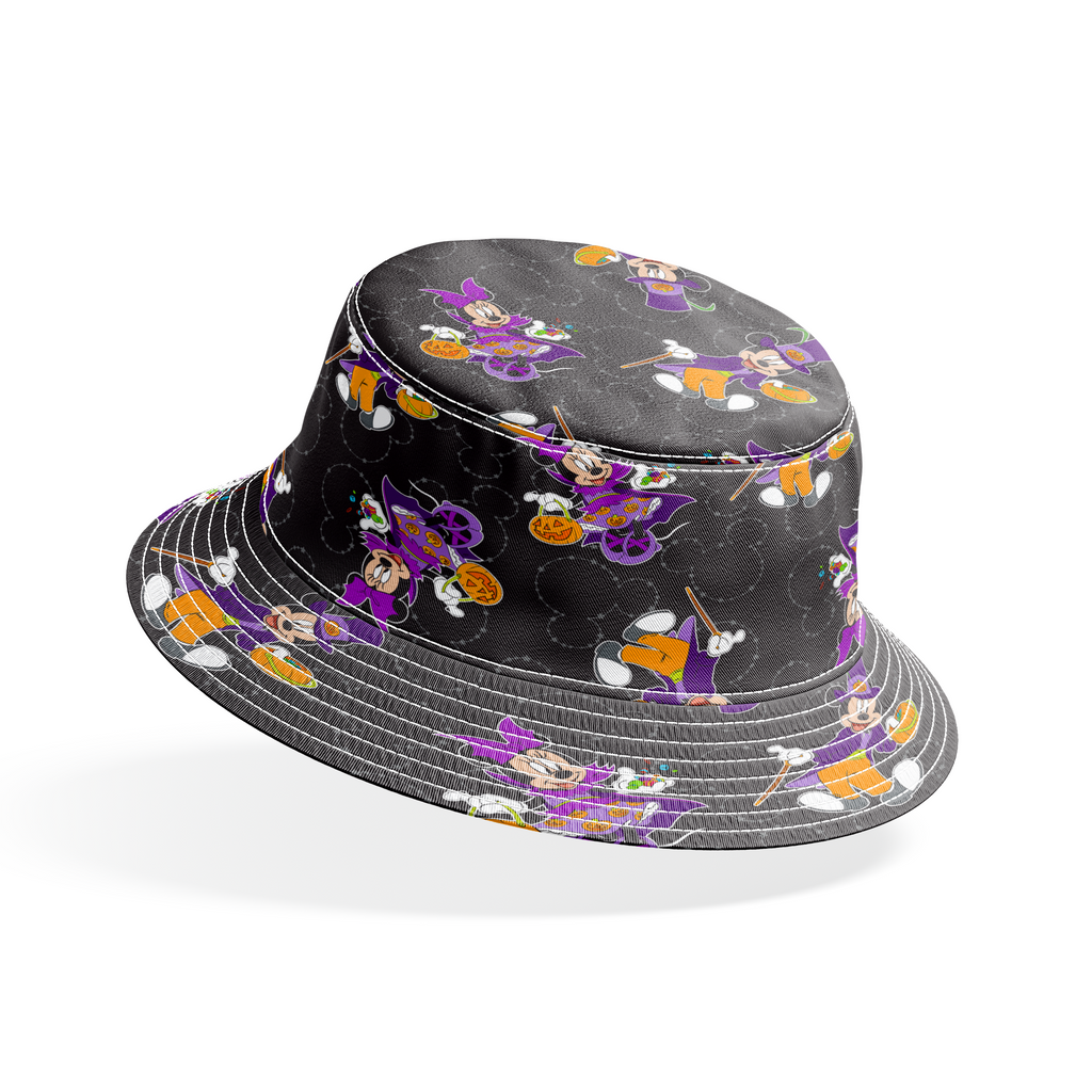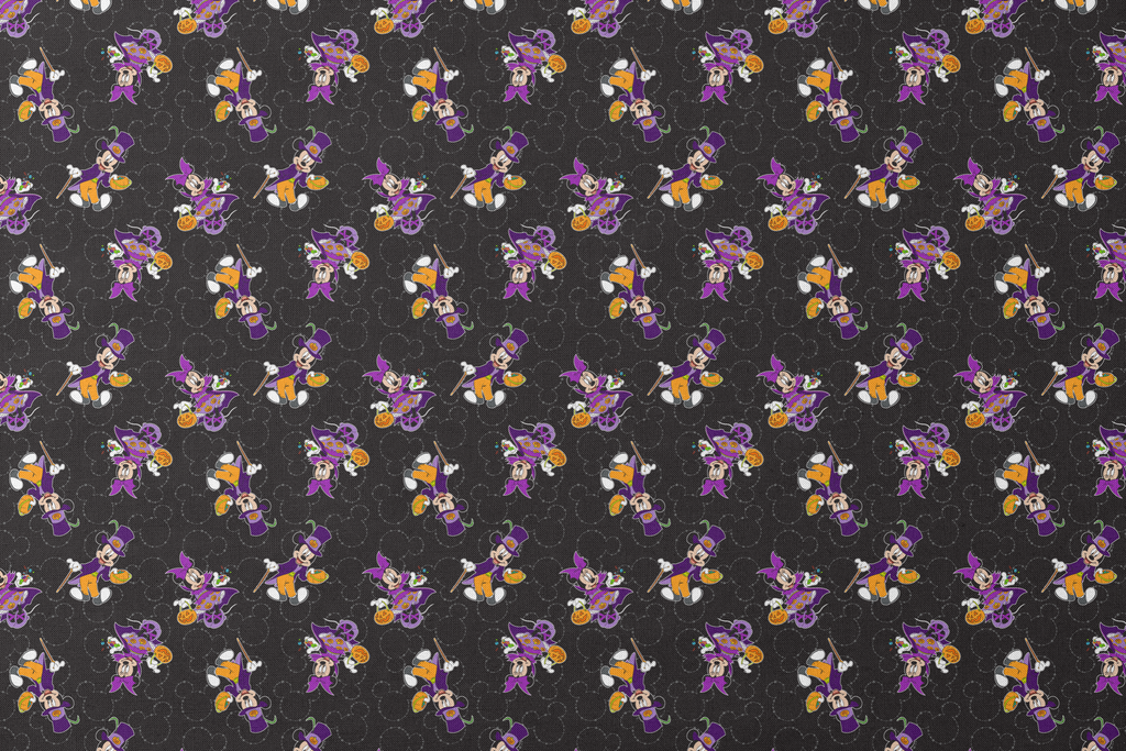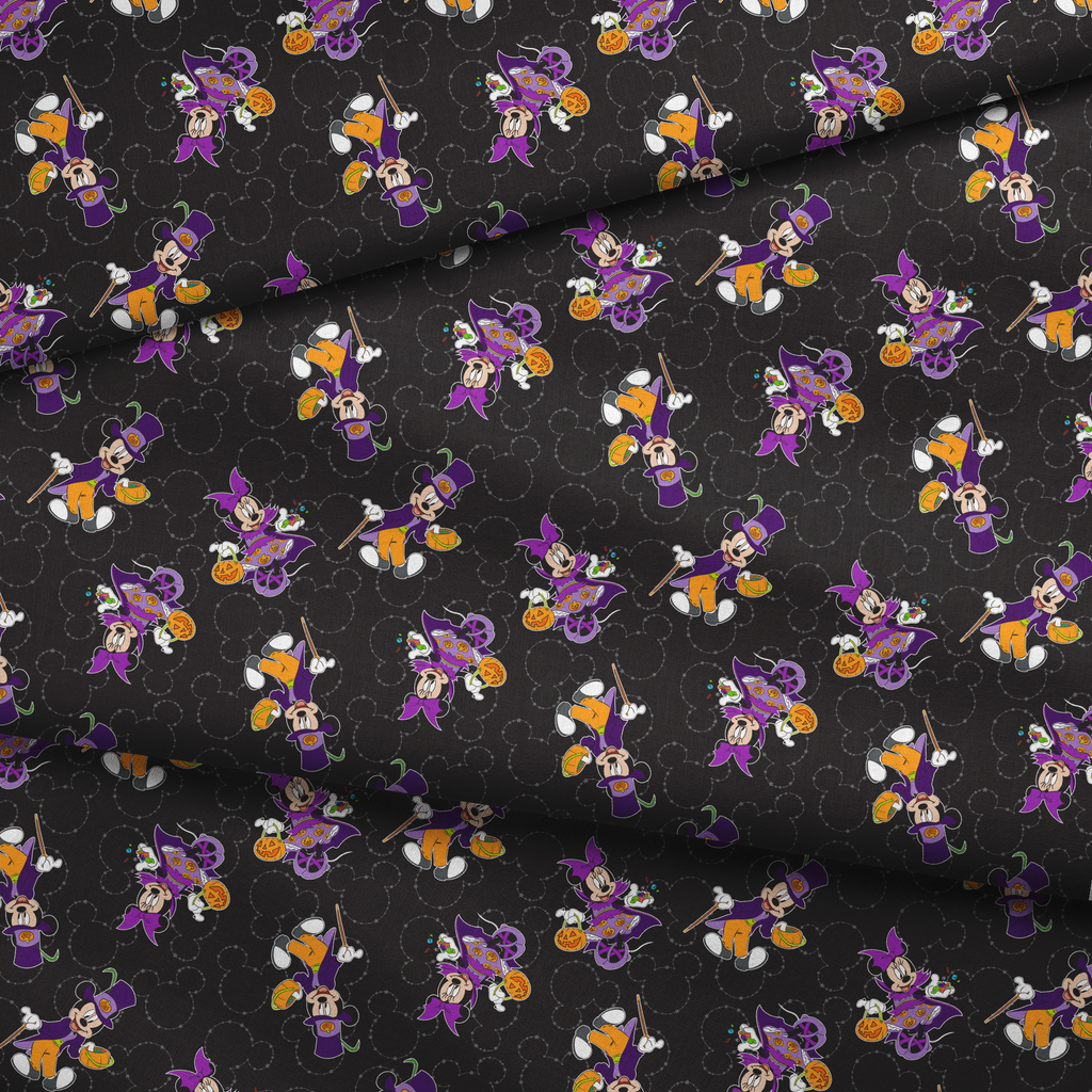 Disney Halloween fabric featuring Mickey Mouse and Minnie Mouse in purple witch costumes against a black background with orange pumpkins - perfect for spooky season crafting projects.