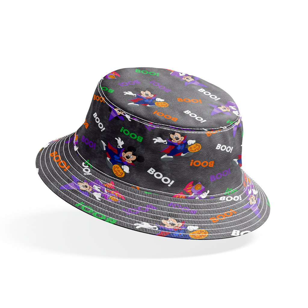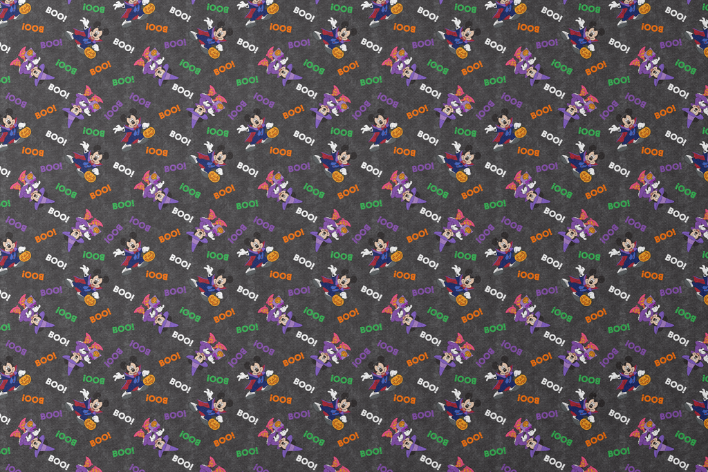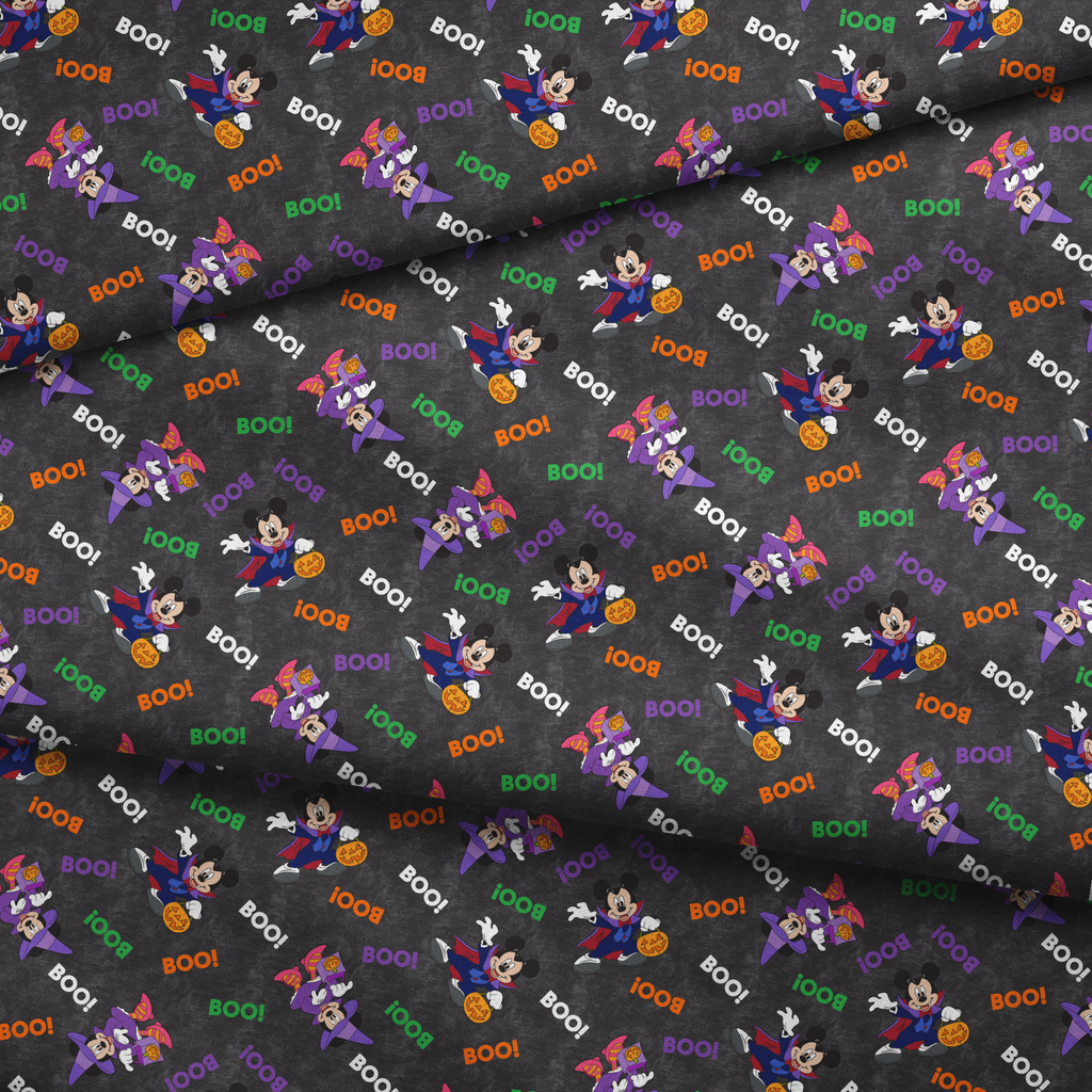 Adorable Disney Mickey Mouse Halloween fabric with characters in spooky costumes! Features playful "BOO!" text in purple, orange, and green on a dark charcoal background - perfect for festive seasonal projects.