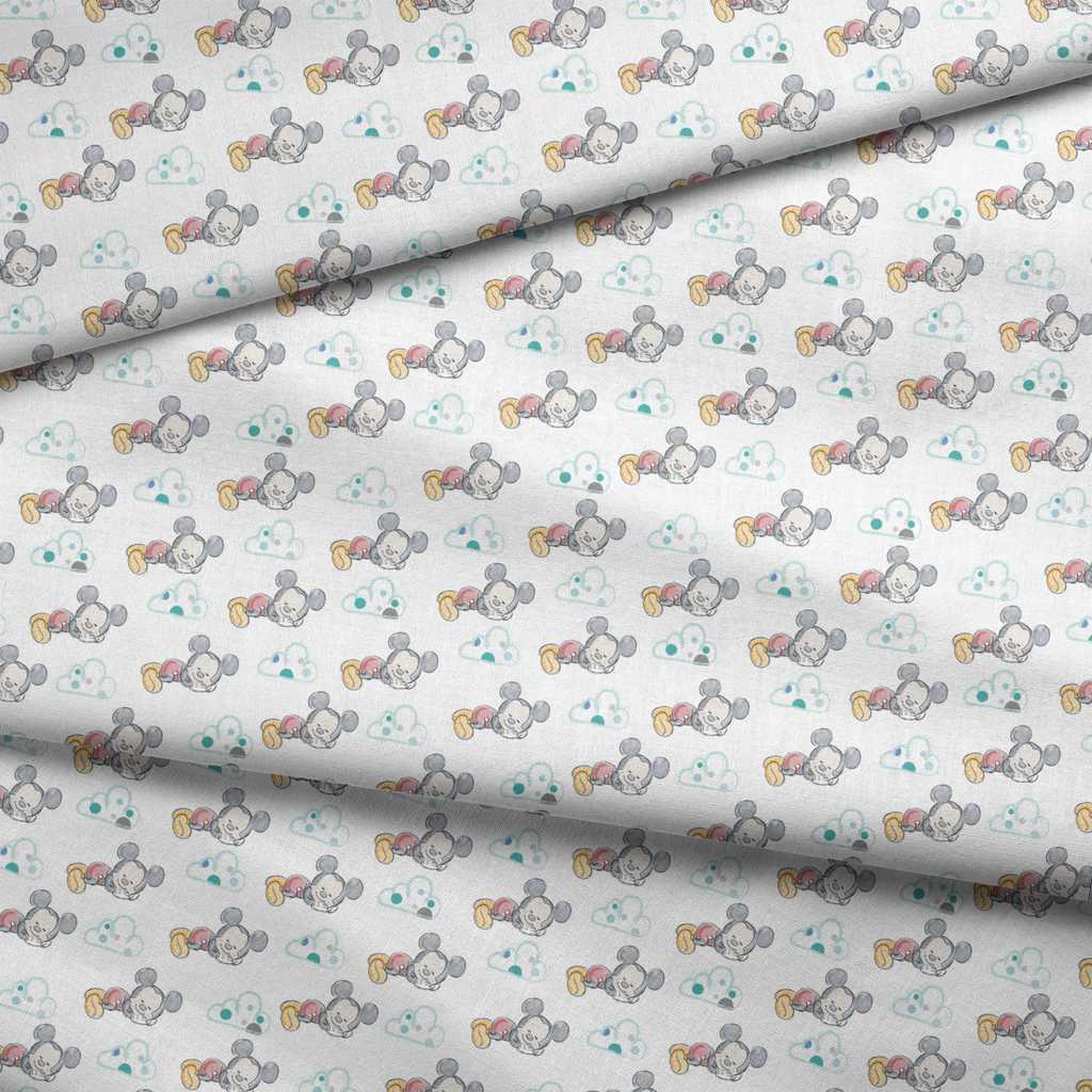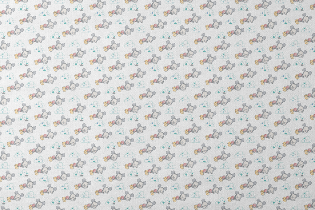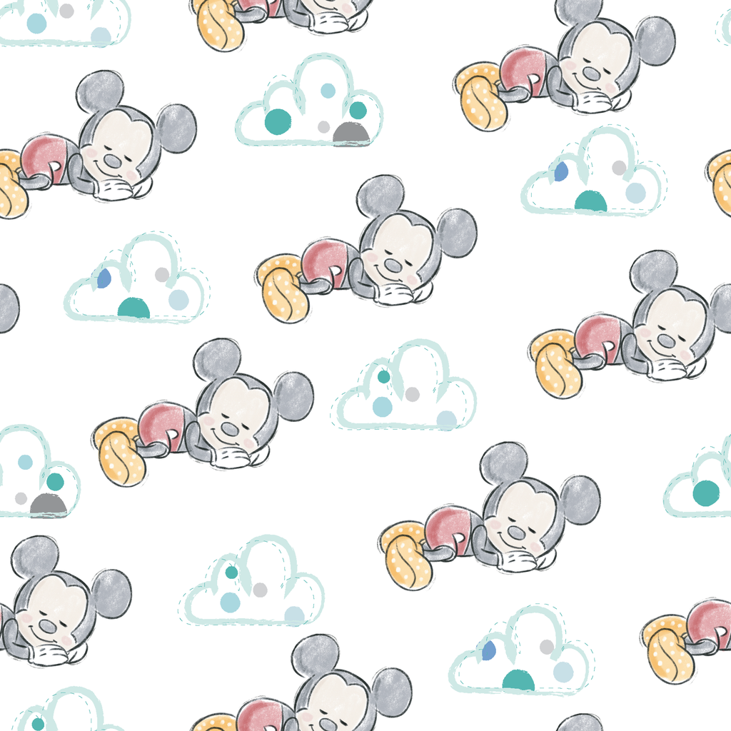 Sweet nursery pattern featuring adorable sleeping Disney Mickey Mouse on a light background with soft green clouds, perfect for nursery decor.