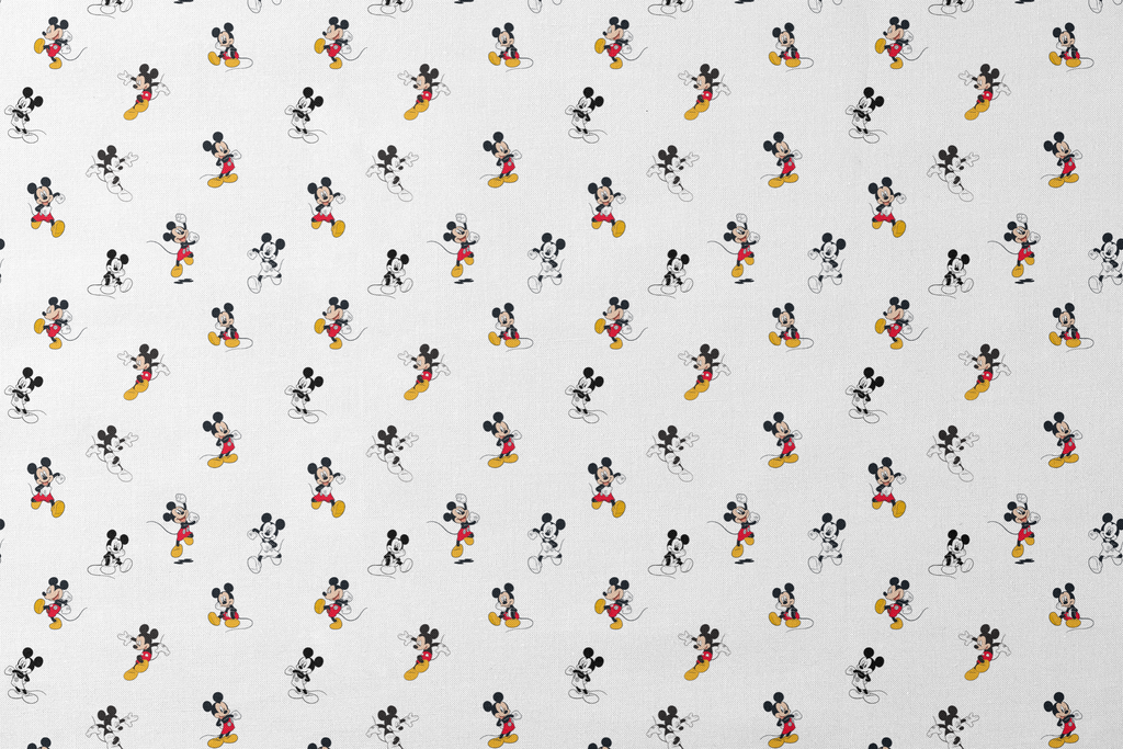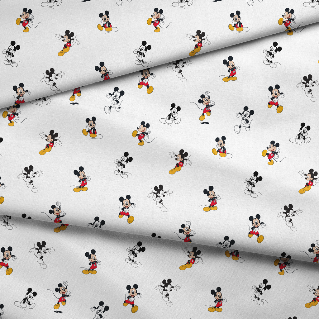 Officially licensed Disney Mickey Mouse fabric featuring the beloved character in playful poses. Dressed in his signature red shorts and yellow shoes, Mickey stands out on a crisp white background—perfect for quilts, kids’ apparel, and fun home decor. ©Disney