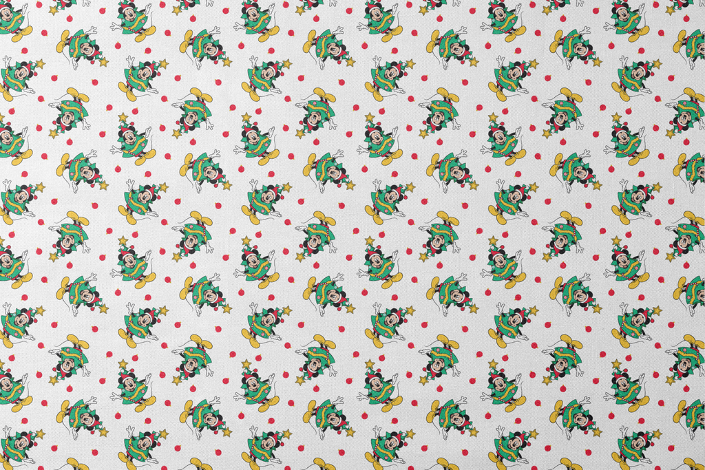 Festive holiday pattern featuring Mickey Mouse in a Christmas tree costume against a white background with red polka dots. Perfect for Christmas-themed children's apparel and decor.