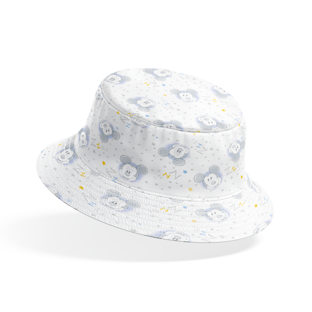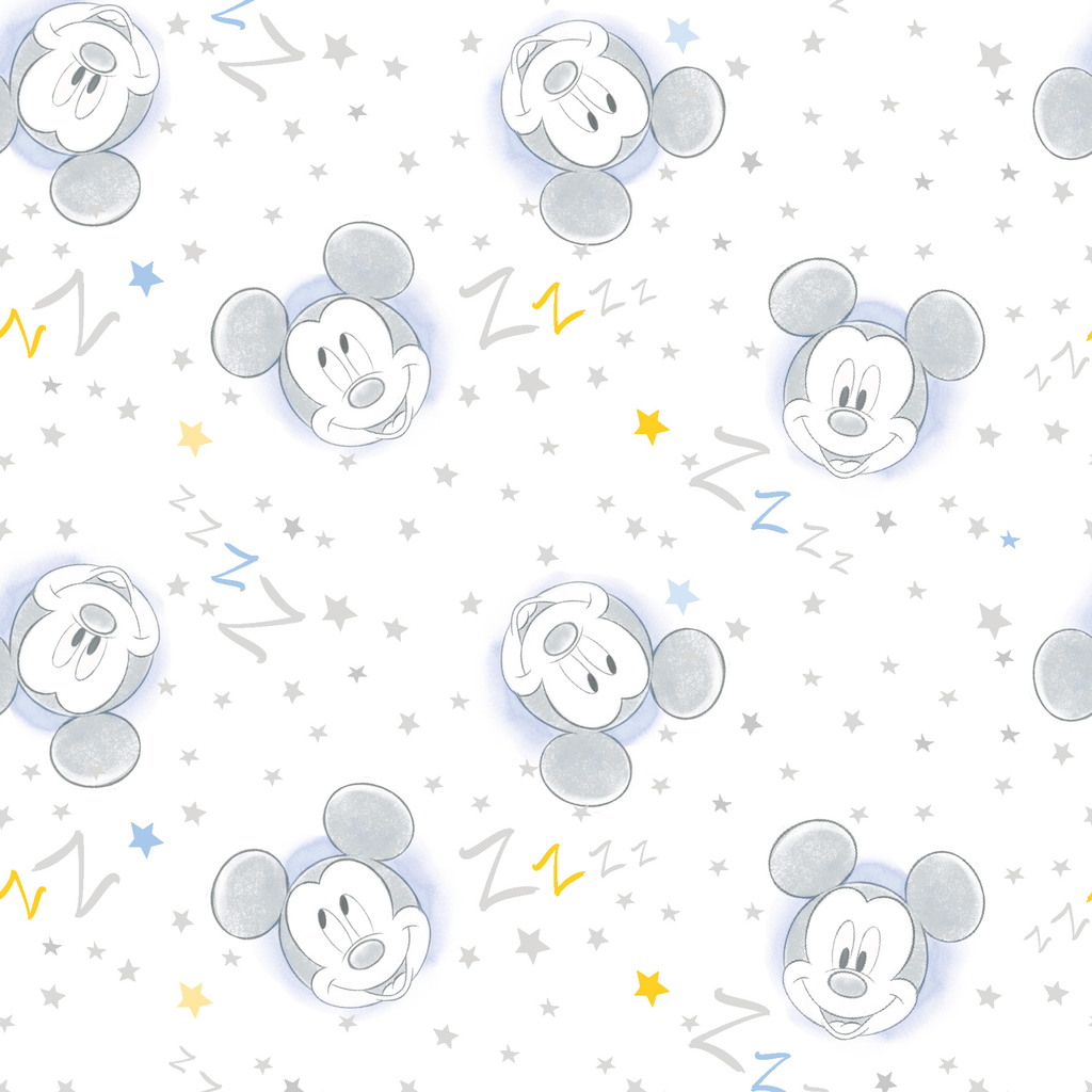 Adorable Disney Mickey Mouse pattern featuring sketched faces on a white background with light blue stars and yellow accents. Perfect for Disney nursery decor or kids' room themes.