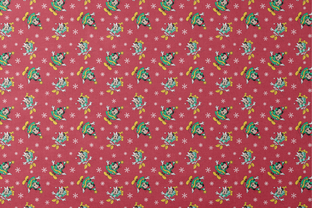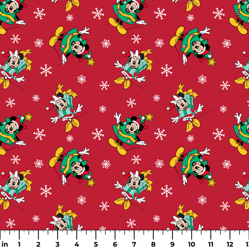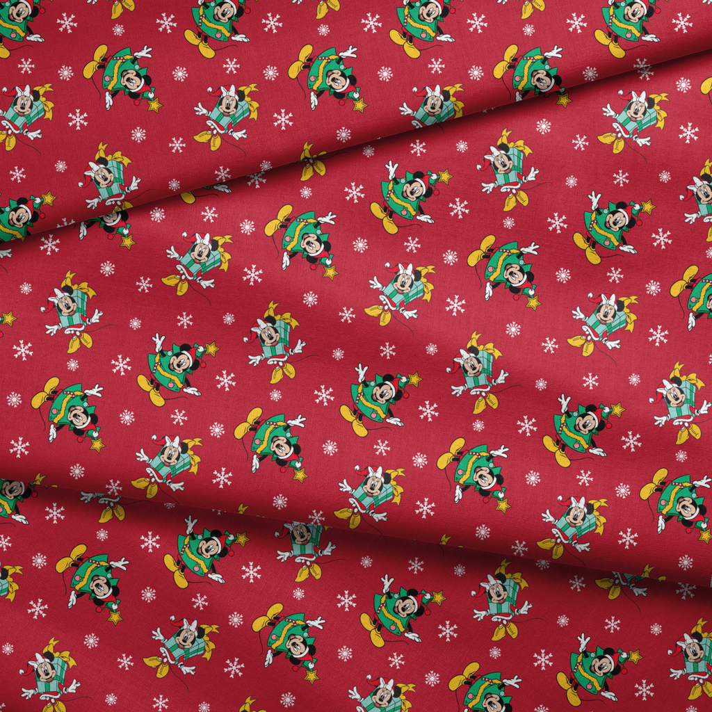 Festive holiday fabric featuring Disney characters wearing green elf hats on a bright red background with white snowflakes - perfect for Christmas crafting and seasonal decor.