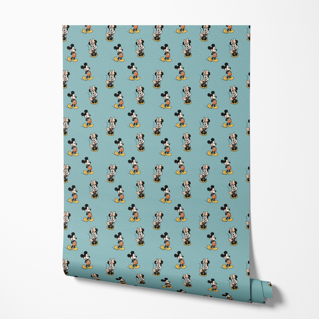 Classic Disney Mickey Mouse and Minnie Mouse pattern on teal background with white polka dots. Retro Disney-inspired design perfect for any space.