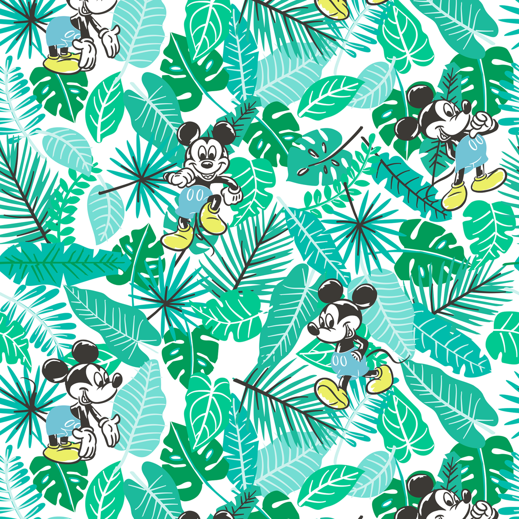 Vibrant tropical Disney Mickey Mouse pattern features the classic Disney character frolicking among turquoise palm leaves and green monstera foliage. Perfect for home decor or crafting projects.