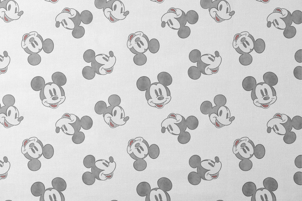 Classic Disney Mickey Mouse pattern featuring nostalgic black and white sketches of the iconic Disney character with various expressions on a light background.