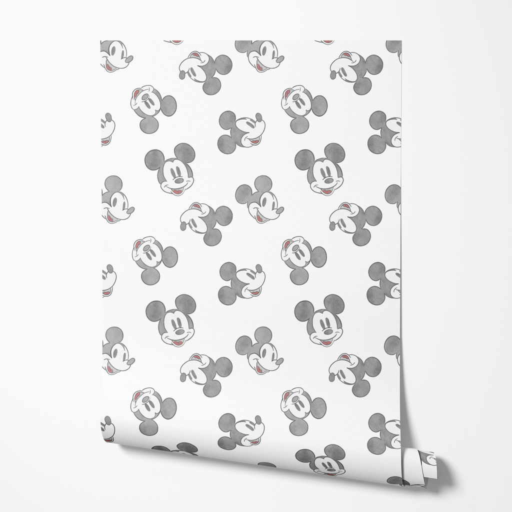 Classic Disney Mickey Mouse pattern featuring nostalgic black and white sketches of the iconic Disney character with various expressions on a light background.