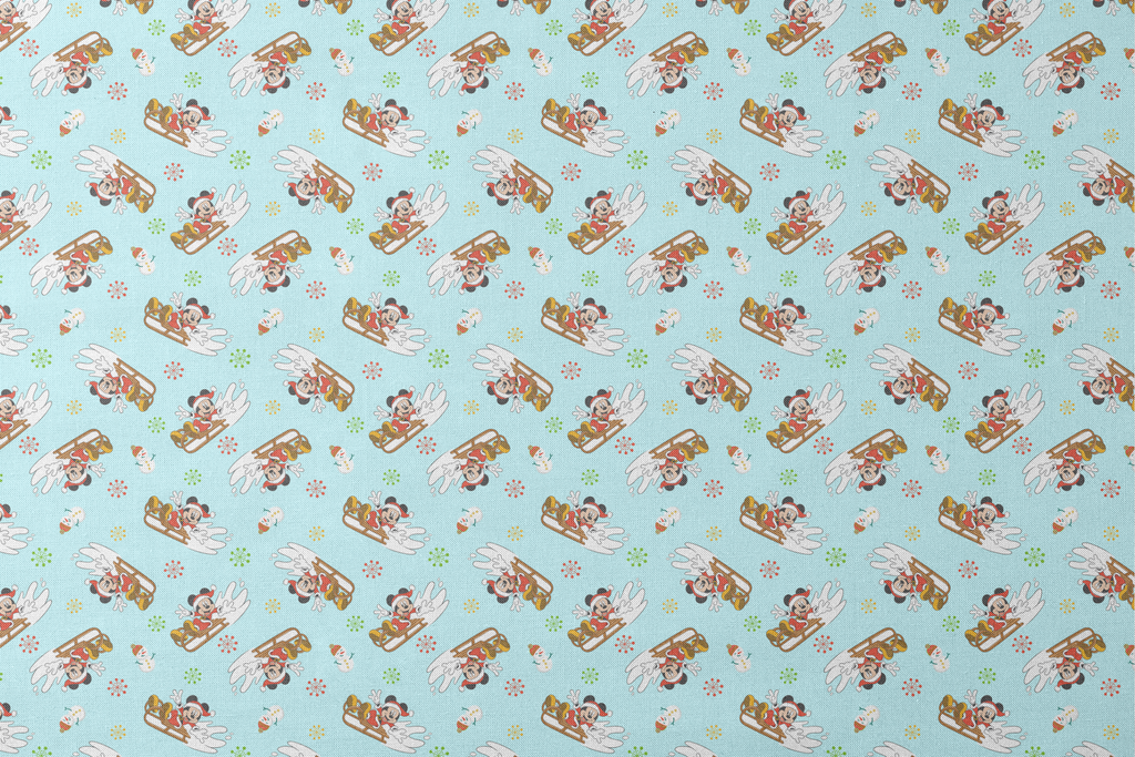 Festive holiday pattern featuring Disney Mickey Mouse on sleighs with snowflakes on a light blue background. Perfect for winter decor, Christmas crafts, or Disney-themed celebrations.