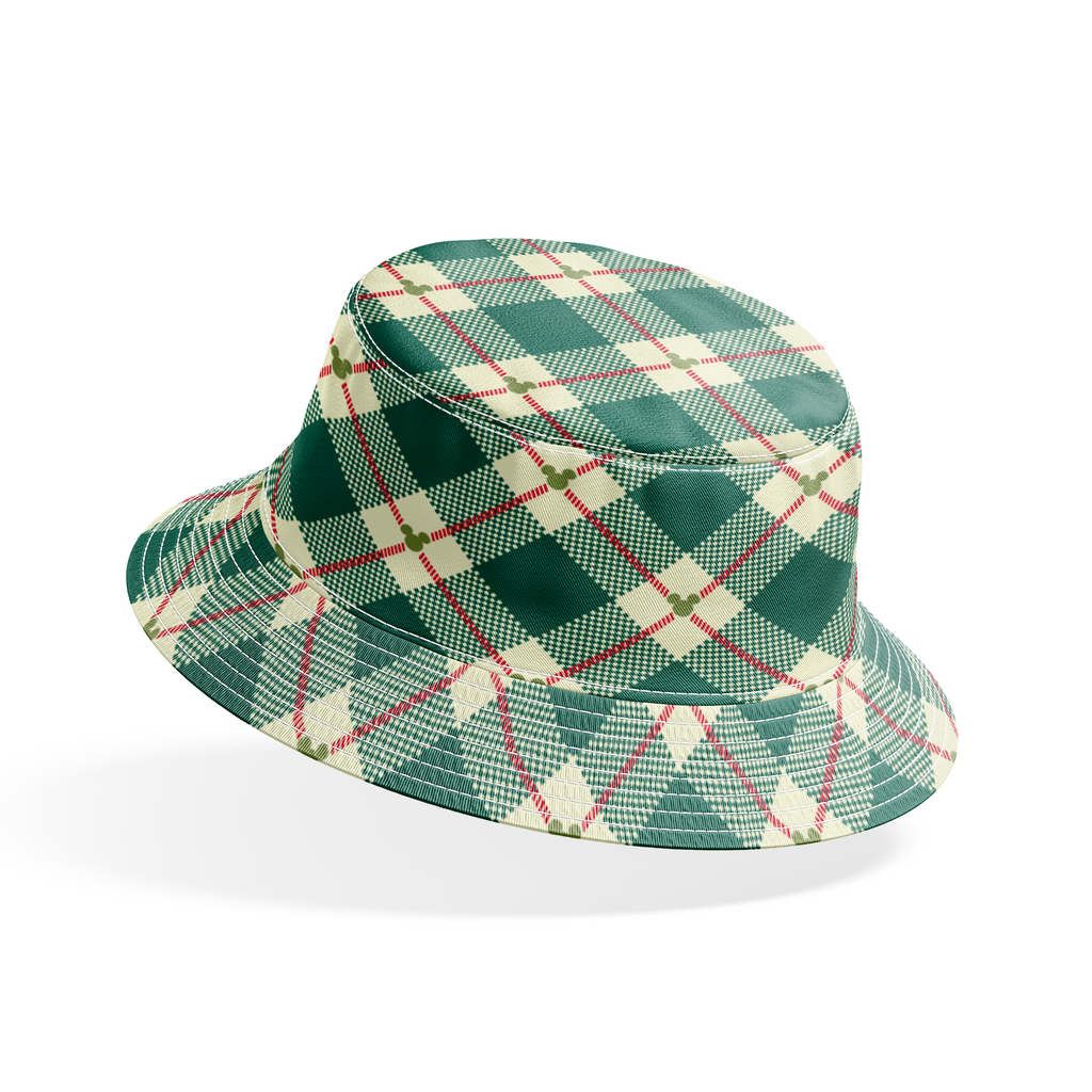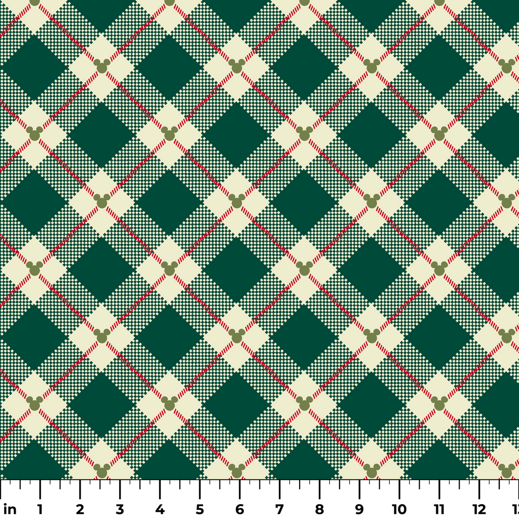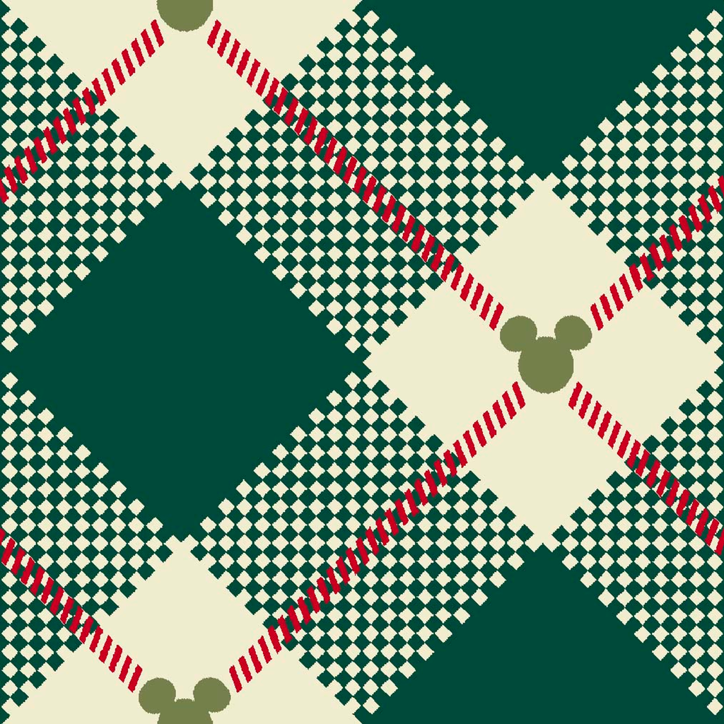 Traditional holiday plaid in forest green and cream with red accents and subtle Disney Mickey Mouse motifs creates a festive Disney-inspired pattern perfect for Christmas decor.