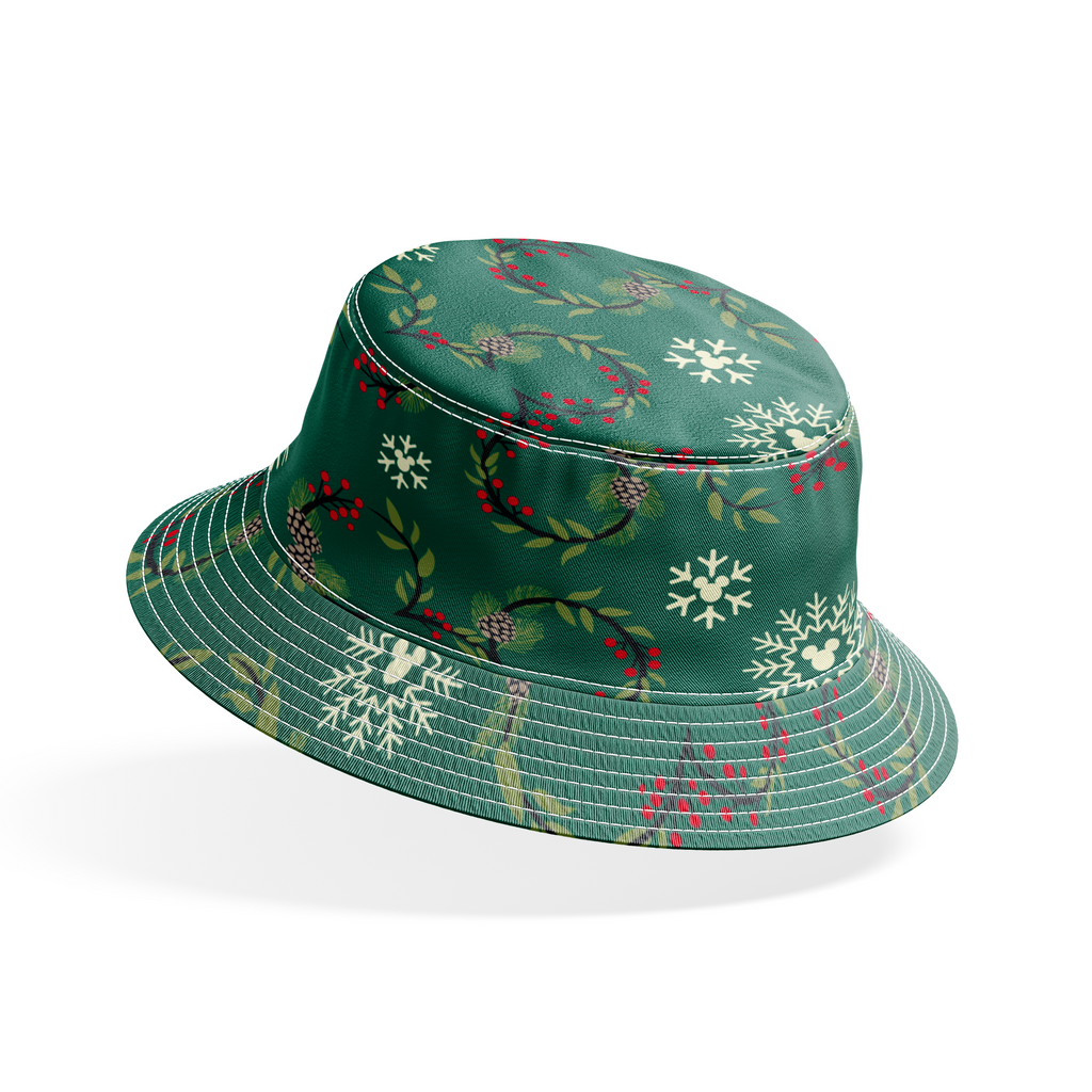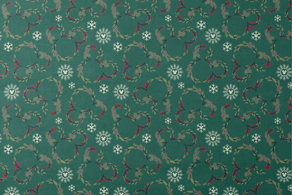 Festive Disney Mickey Mouse forest green pattern with elegant wreath designs, pine cones, and delicate snowflakes - perfect for traditional holiday décor or seasonal crafting projects.