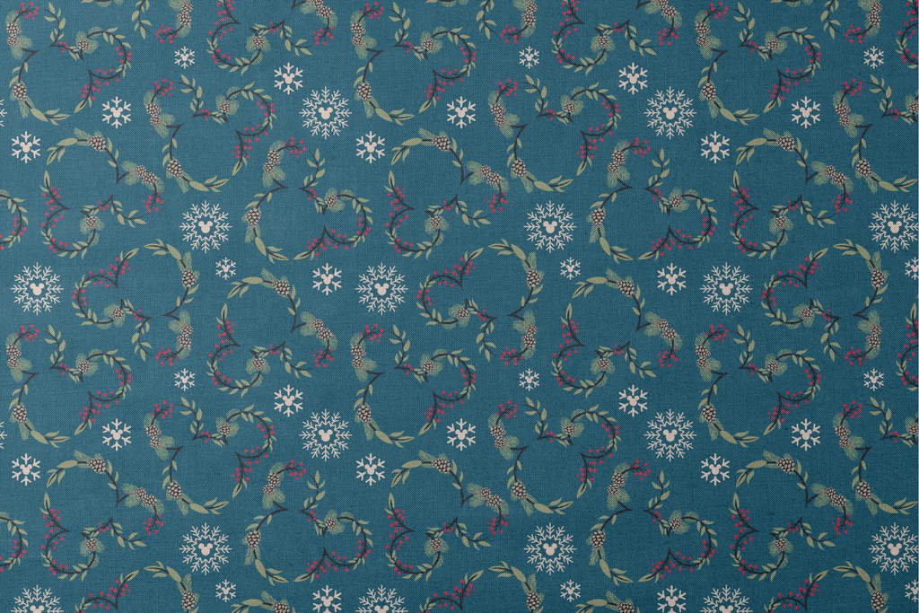 Elegant winter holiday pattern featuring Disney Mickey Mouse botanical wreaths with pine branches, berries, and delicate white snowflakes on a rich teal background.