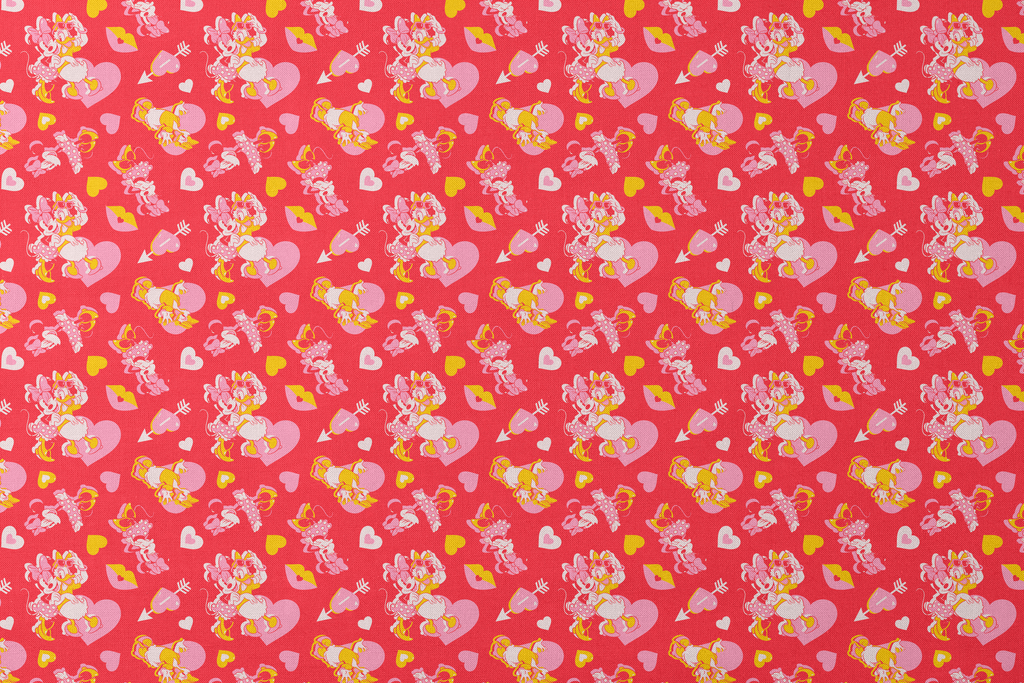 This vibrant red background features Disney Minnie Mouse and Daisy Duck with heart accents in shades of pink and yellow, perfect for Valentine's Day crafting or children's apparel.