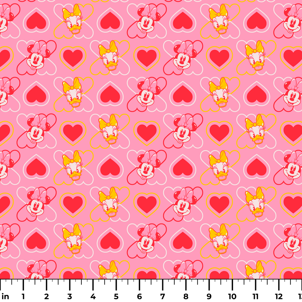 Disney Minnie Mouse and Daisy Duck Hearts Head Toss on Pink Fabric
