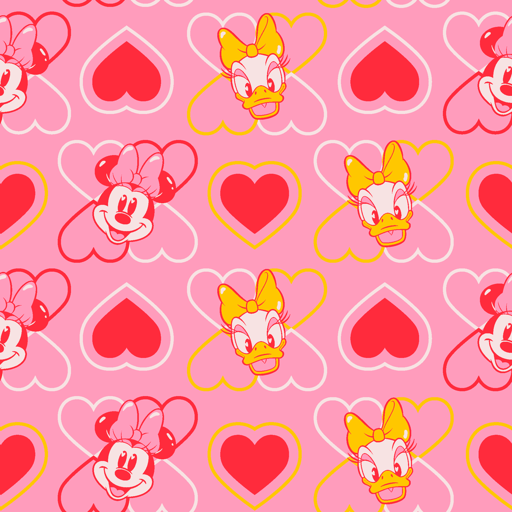 Adorable Disney Minnie Mouse and Daisy Duck on a pink background with heart outlines. Perfect for Disney fans who love these two iconic characters.