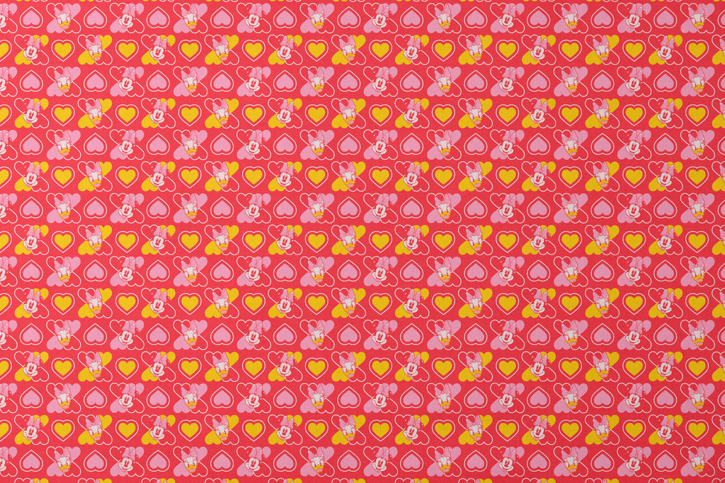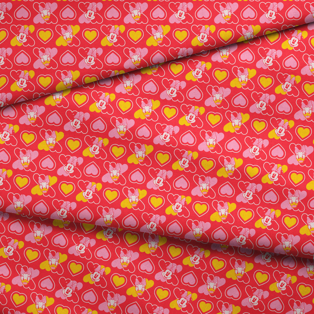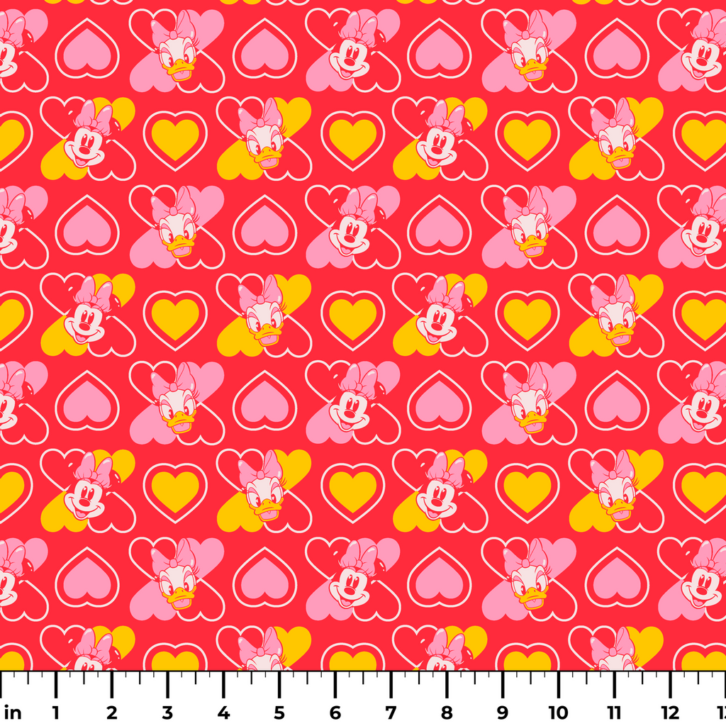 Adorable Disney Minnie Mouse and Daisy Duck head toss with pink and yellow hearts on a vibrant red background. Perfect for Valentine's Day crafting projects.