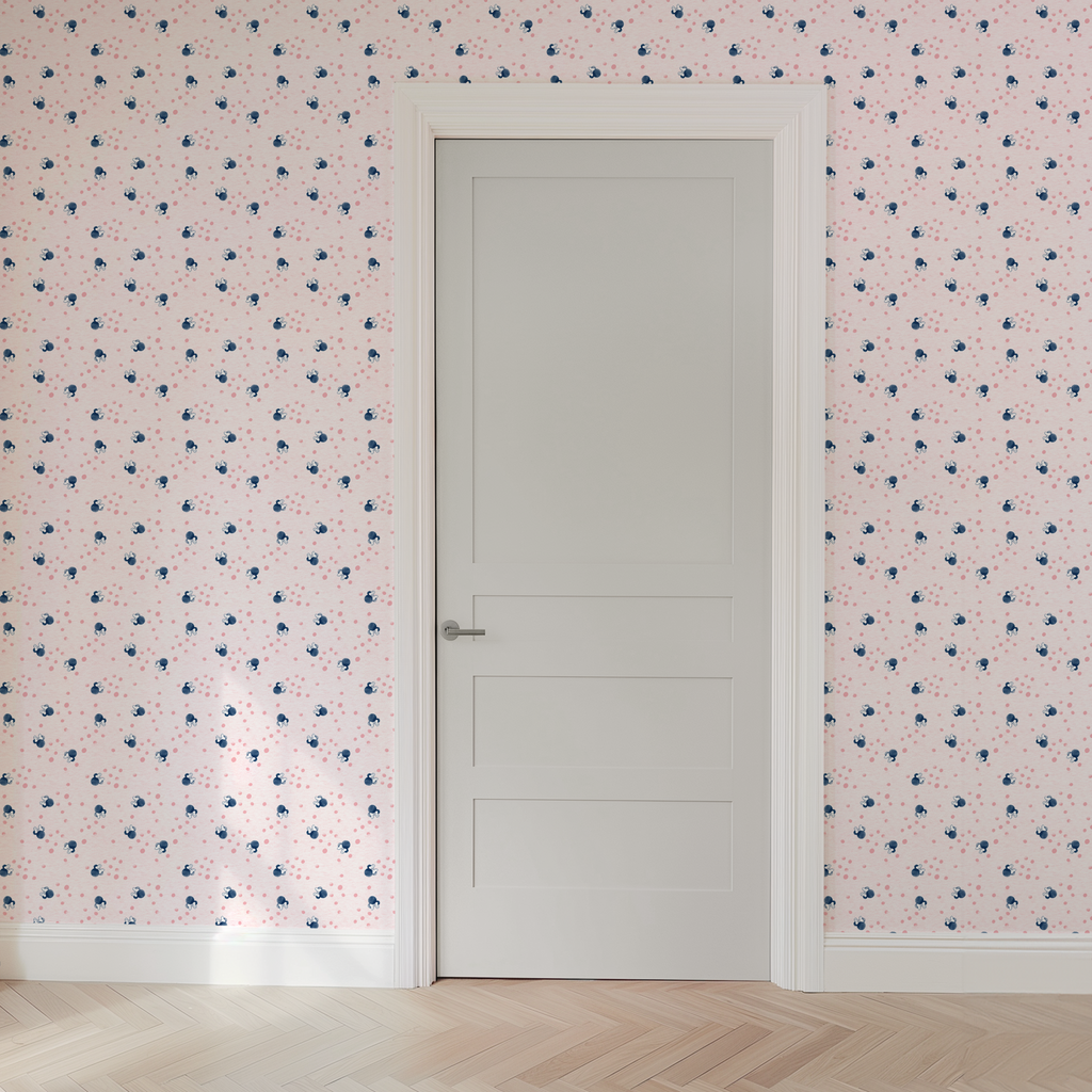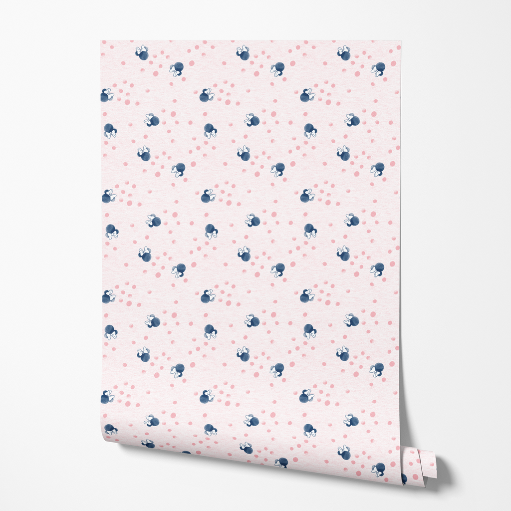 Adorable Disney Minnie Mouse silhouettes in navy blue with white bows, scattered across a soft pink polka dot background. Perfect for Disney lovers and girls' nurseries.