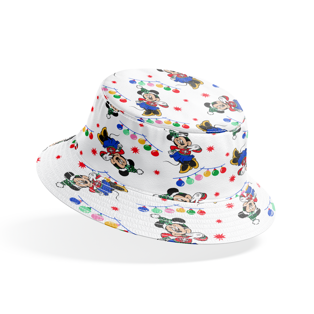 Festive Christmas design with Disney Minnie Mouse wearing Santa hats, surrounded by colorful holiday string lights and red stars on a white background.