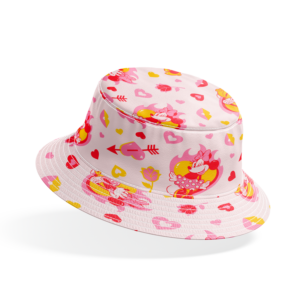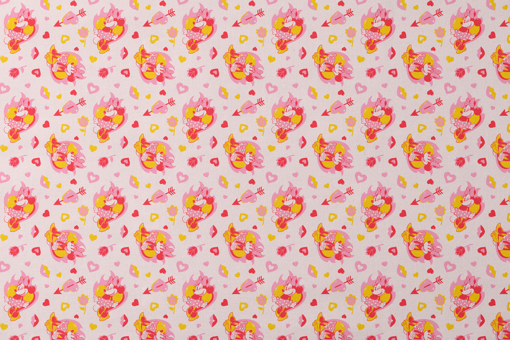 Adorable Disney Minnie Mouse pattern featuring pink and yellow hearts, red arrows, and floral elements on a soft pink background - perfect for Disney fans for their next crafting project.