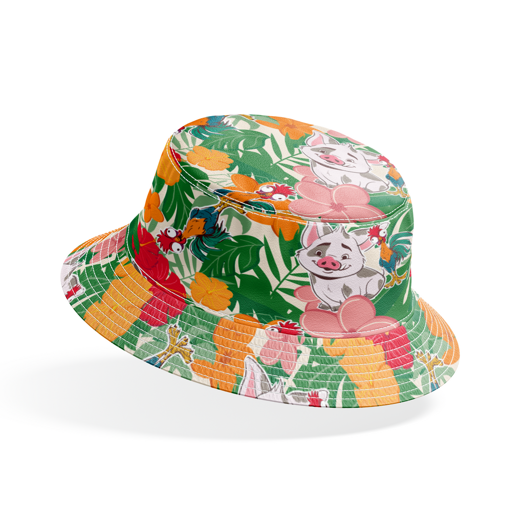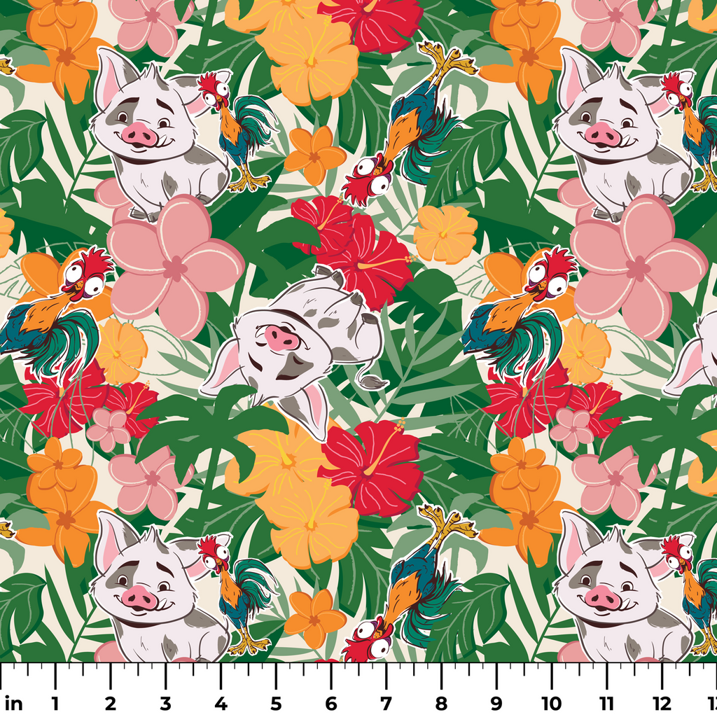 Adorable Disney Moana design features Pua and Heihei tossed among vibrant tropical flowers. Bright orange, pink, red, and yellow blooms create a cheerful tropical garden design.