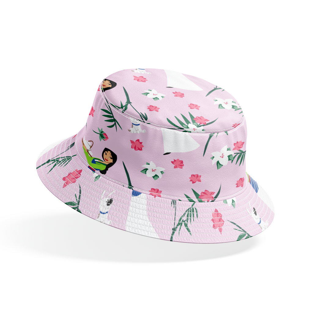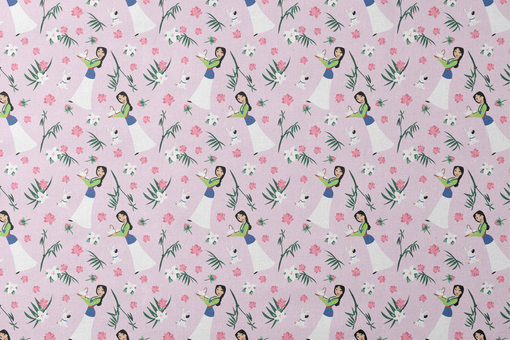 Enchanting Disney Mulan pattern featuring Mulan in flowing white dresses surrounded by delicate pink flowers, white blossoms, and green palm leaves on a soft lavender background.