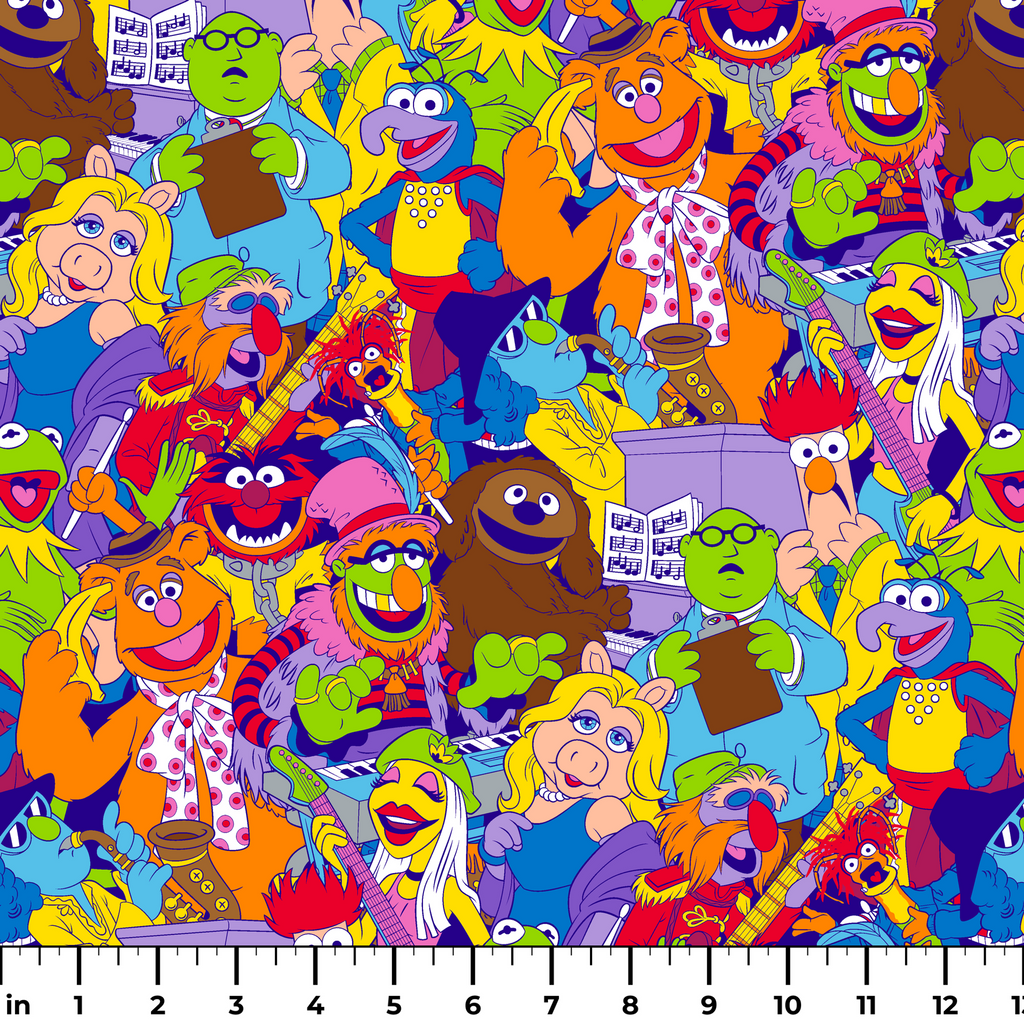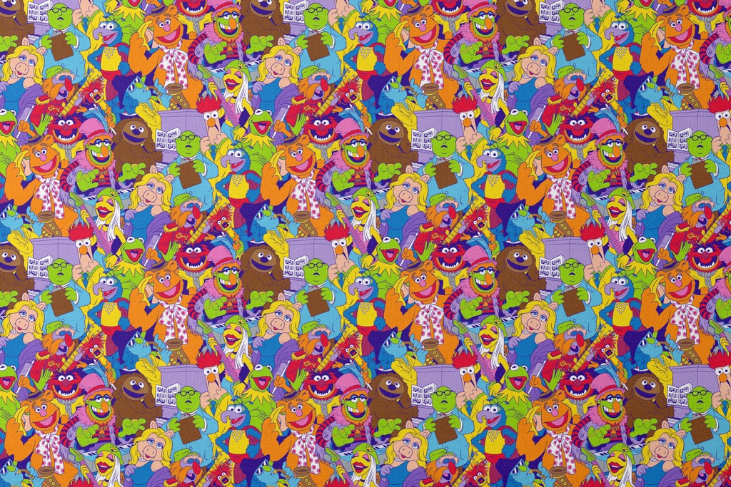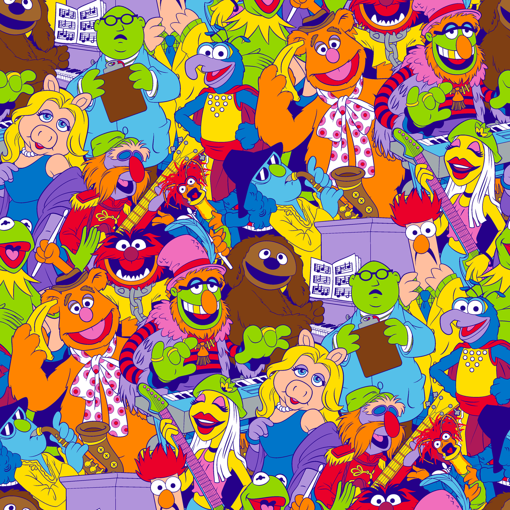 Colorful retro Disney Muppets character pattern featuring Kermit, Miss Piggy, Animal, and friends in a vibrant all-over design perfect for fans of the beloved Jim Henson puppet show.