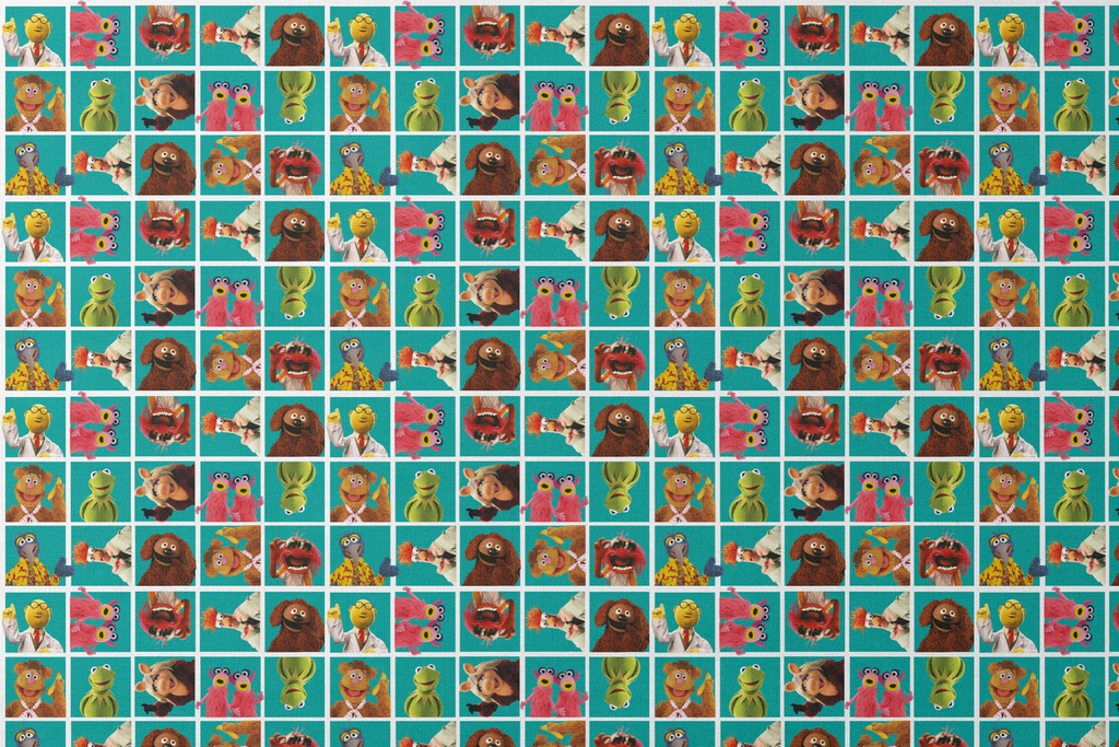 Colorful grid of beloved Disney Muppet characters including Kermit, Rowlf, Miss Piggy, Animal, and more against a bright turquoise background - perfect for fans of Jim Henson's classic puppets.