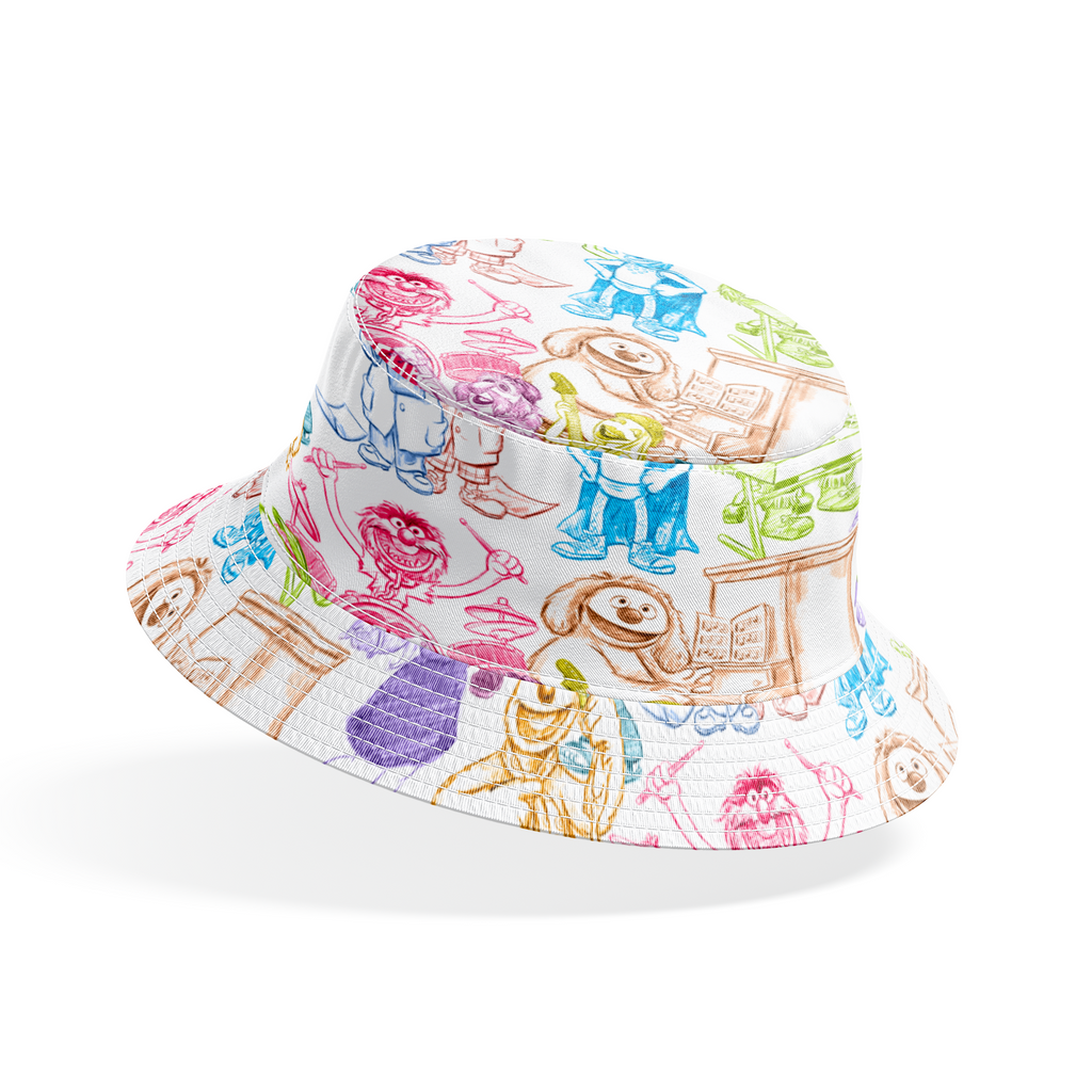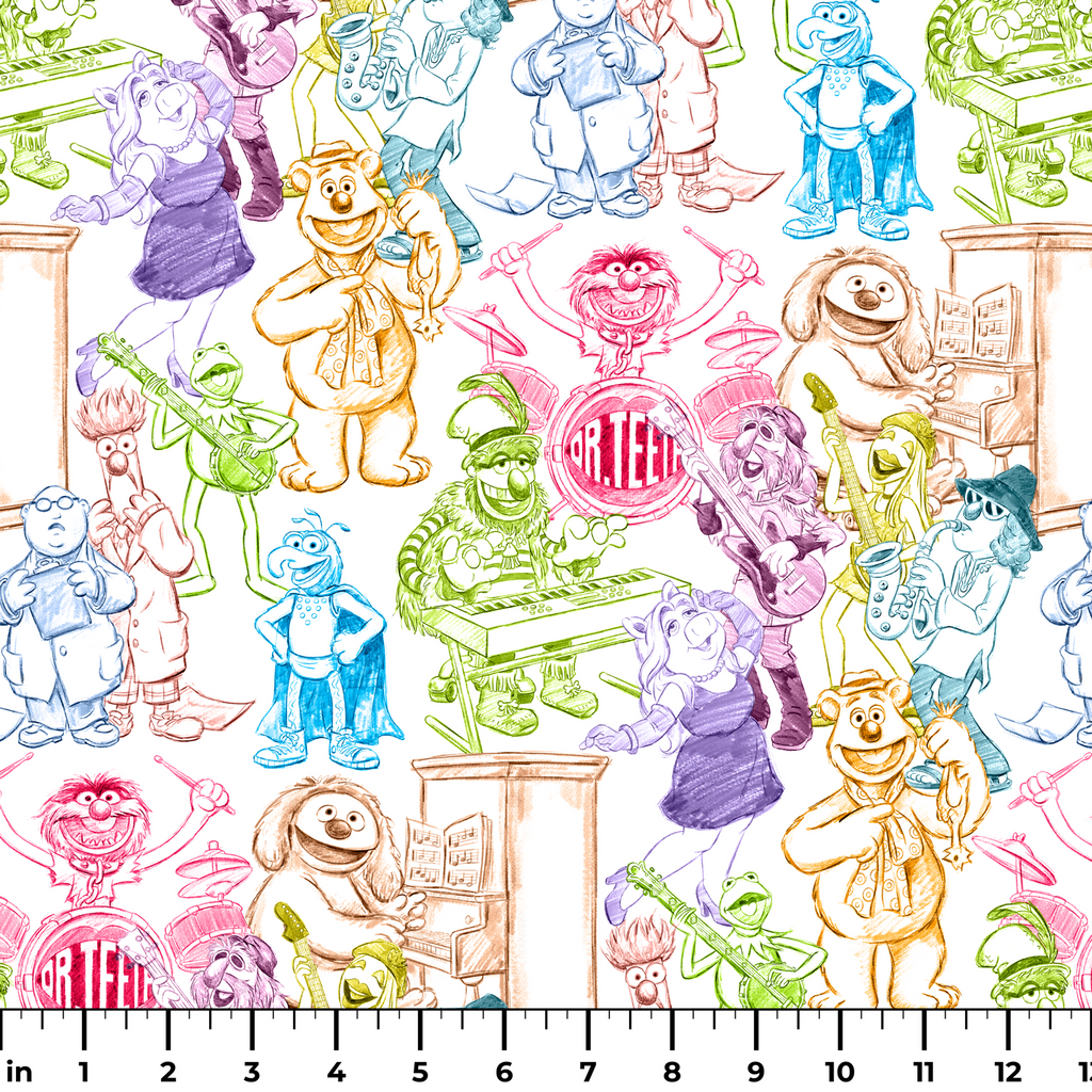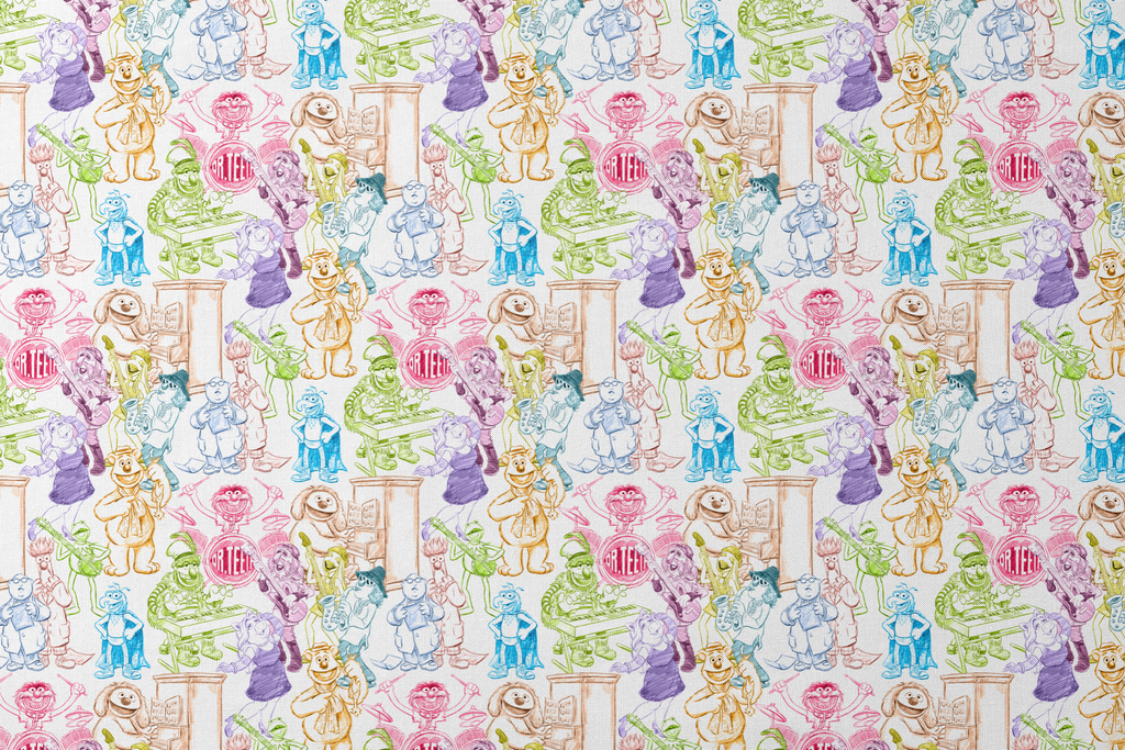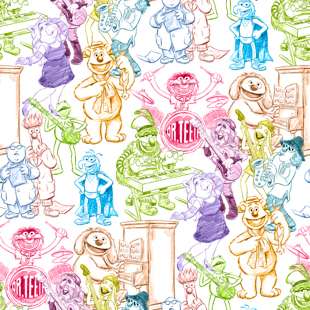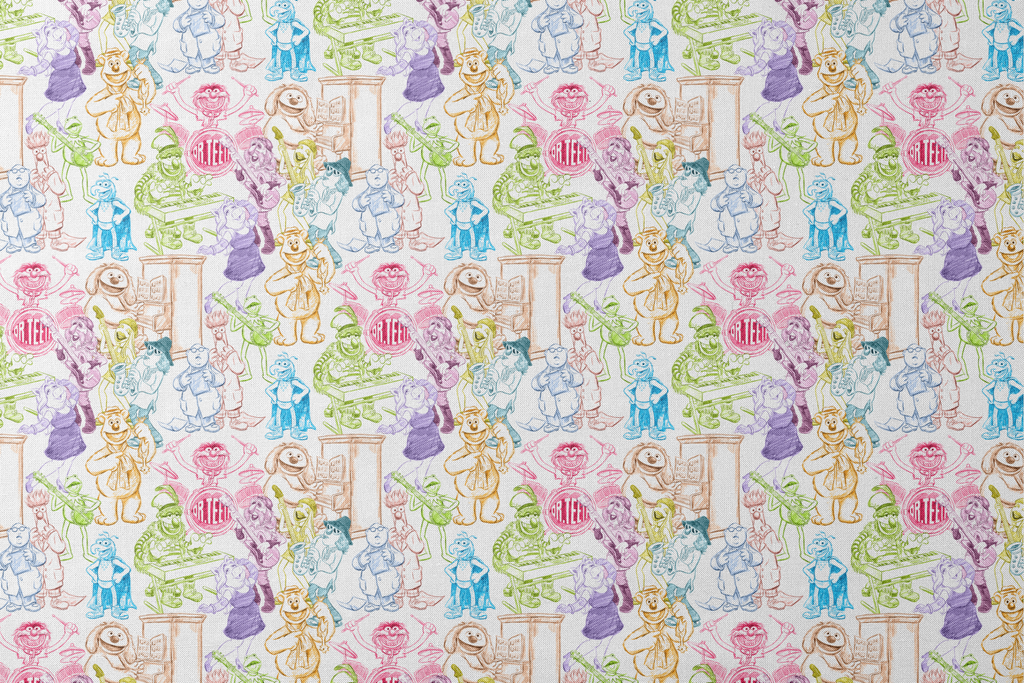 Colorful sketched cartoon Disney Muppets in pink, blue, green, and purple create a playful retro pattern perfect for children's apparel or nursery decor.