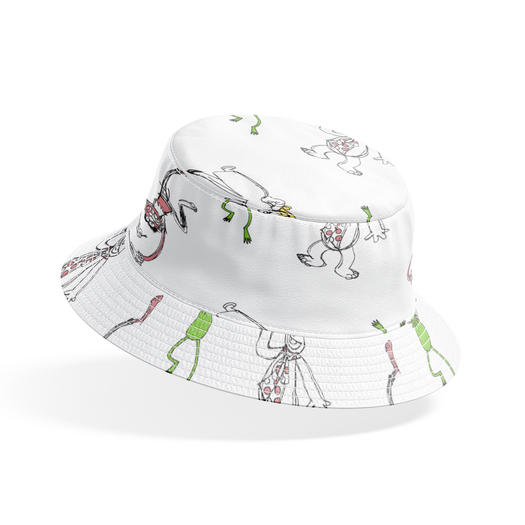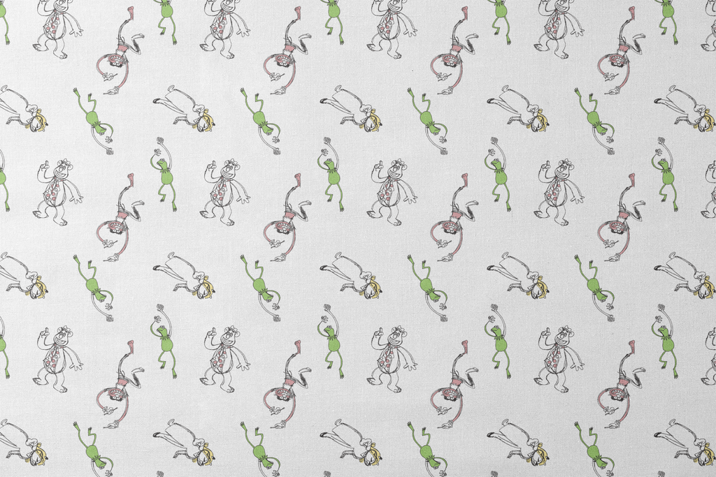 Whimsical cartoon Disney Muppets in playful poses create a fun, animated pattern. Perfect for children's apparel or nursery décor with its light, sketched style and cheerful green and pink accents.