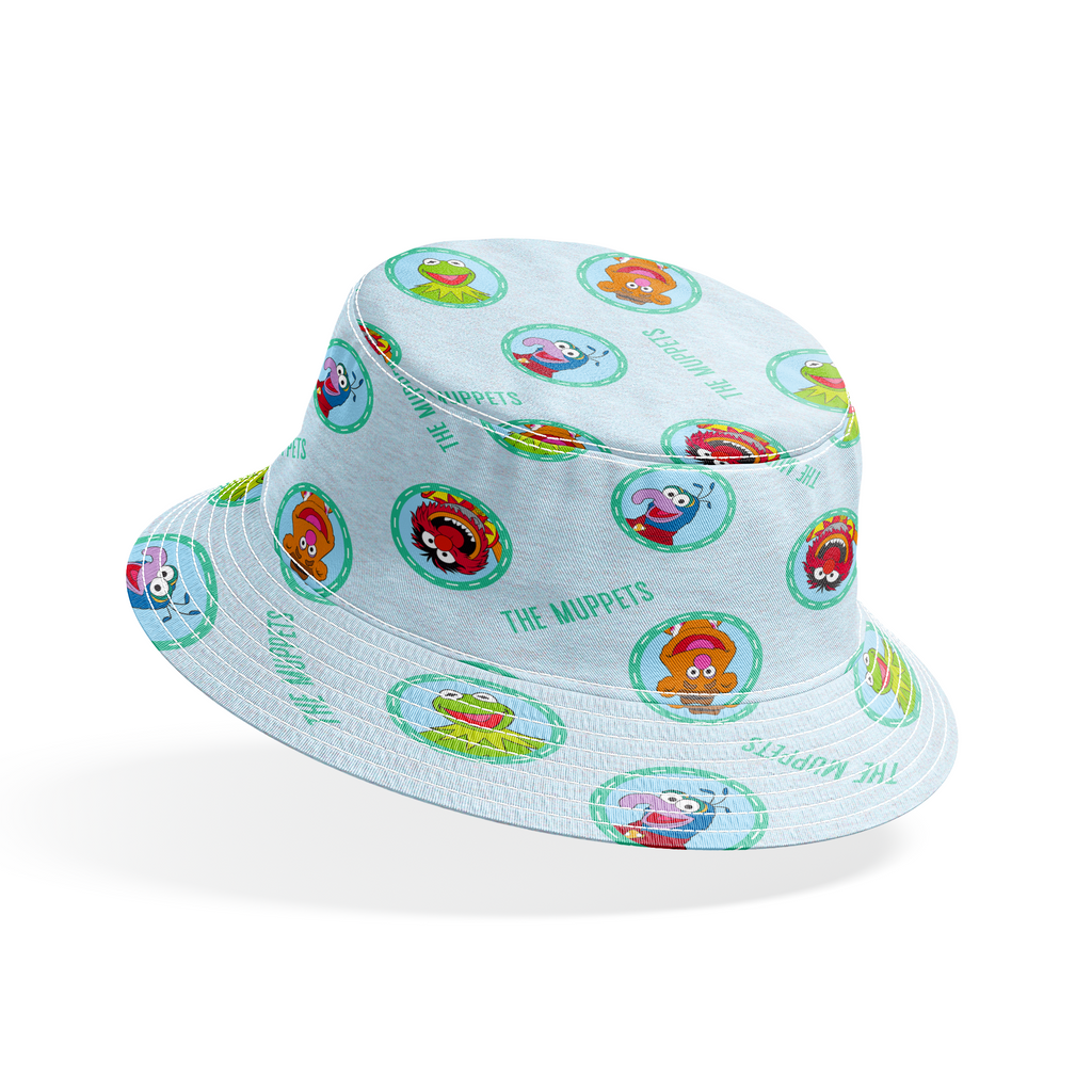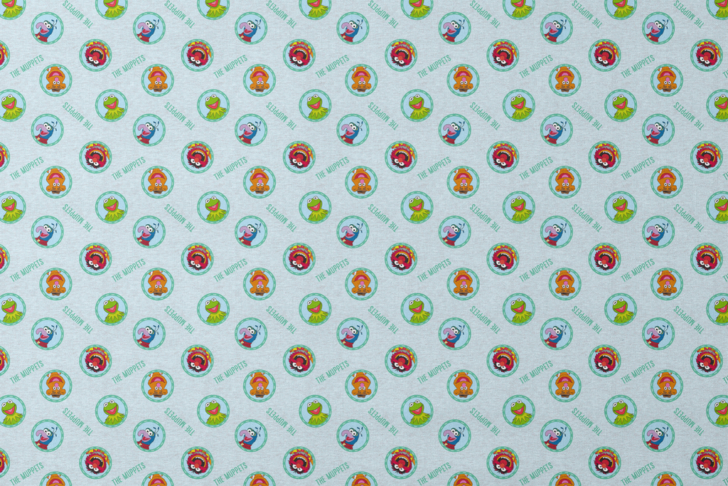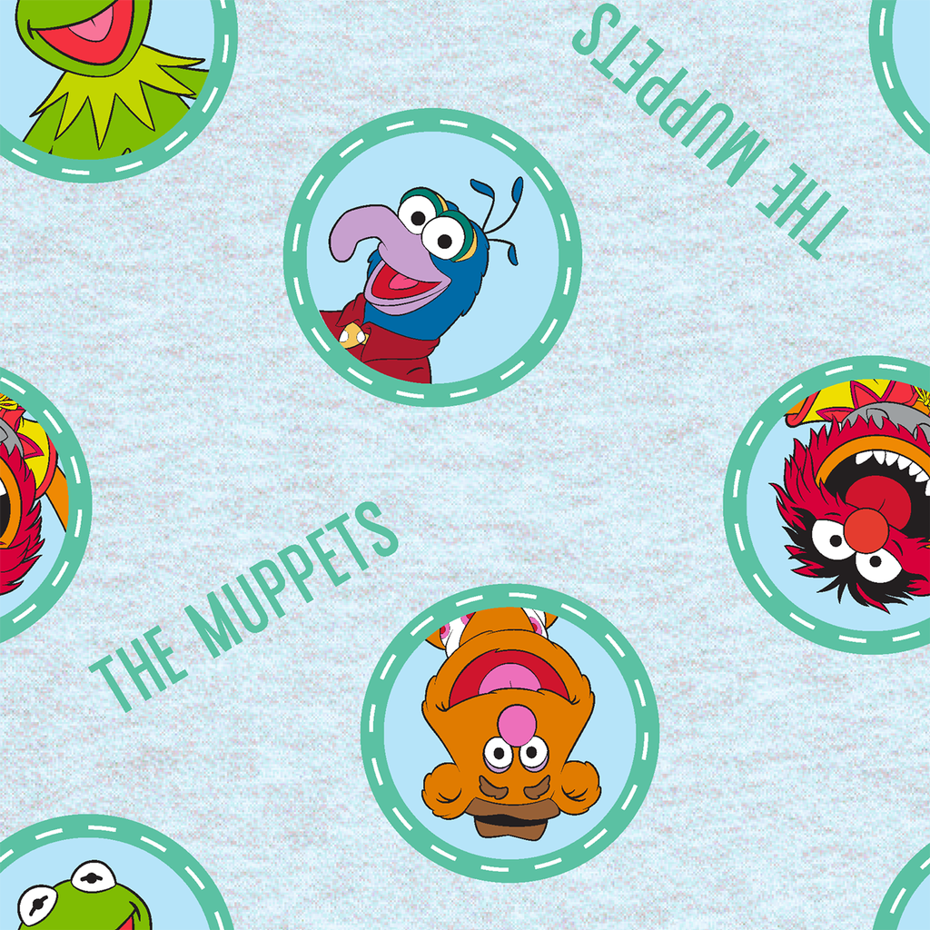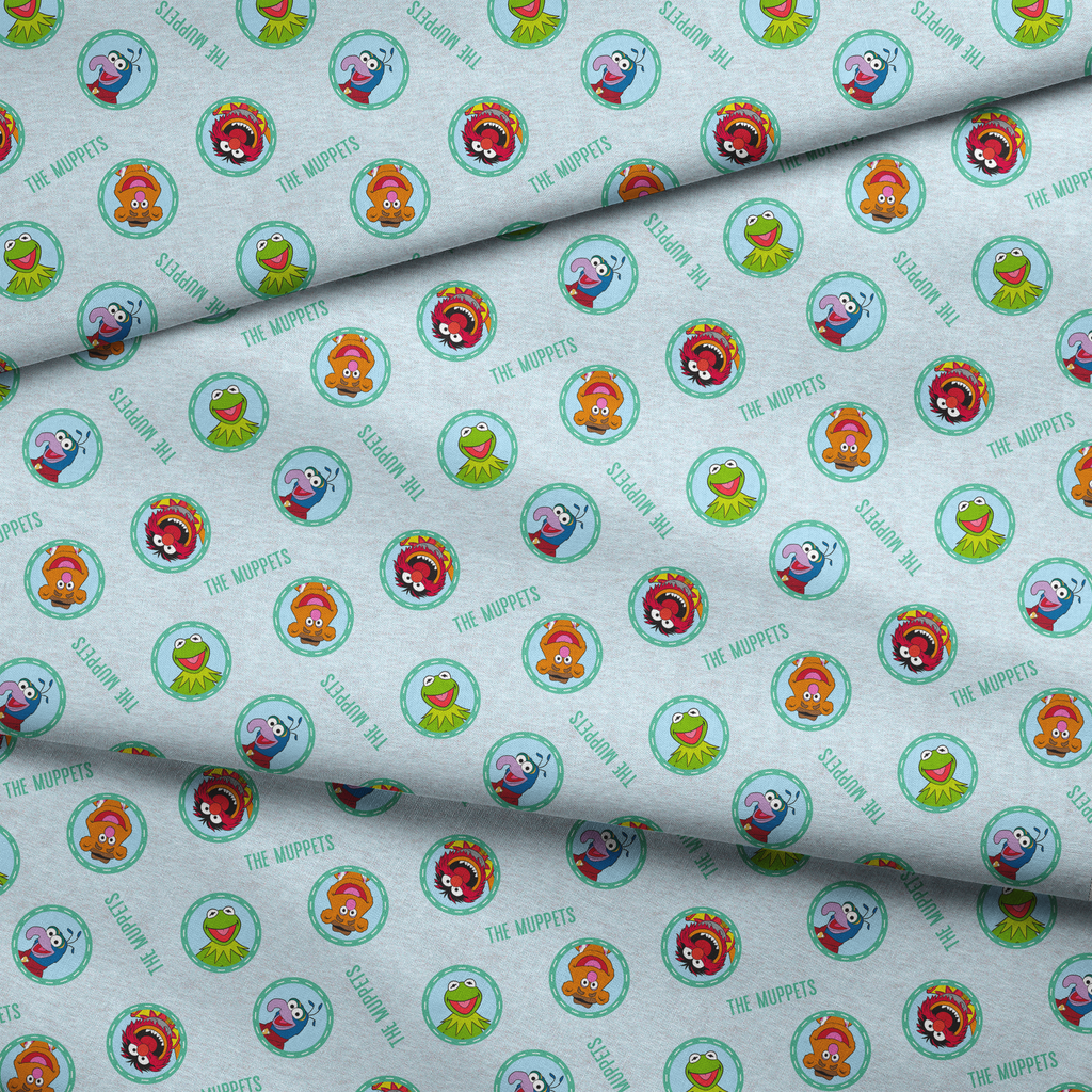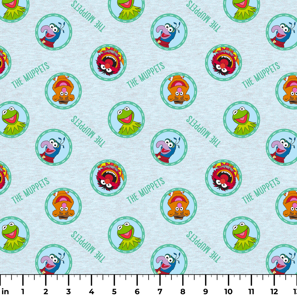Adorable Disney Muppets character fabric featuring Kermit, Gonzo, Animal, and more in colorful circular medallions on a light blue background. Perfect for quilting, children's apparel, and nostalgic home decor projects.