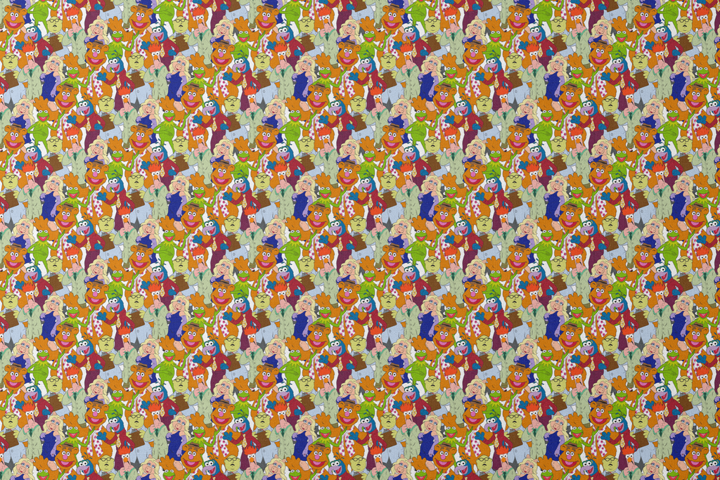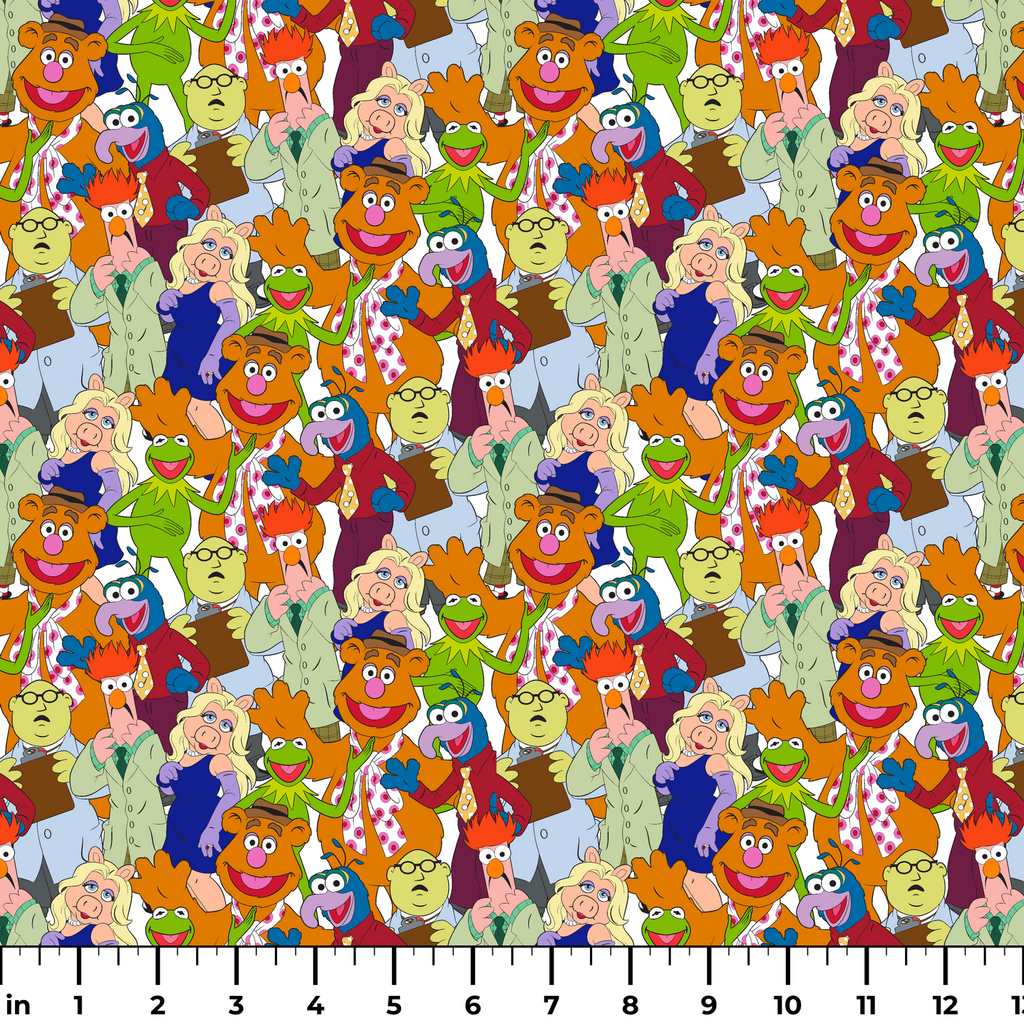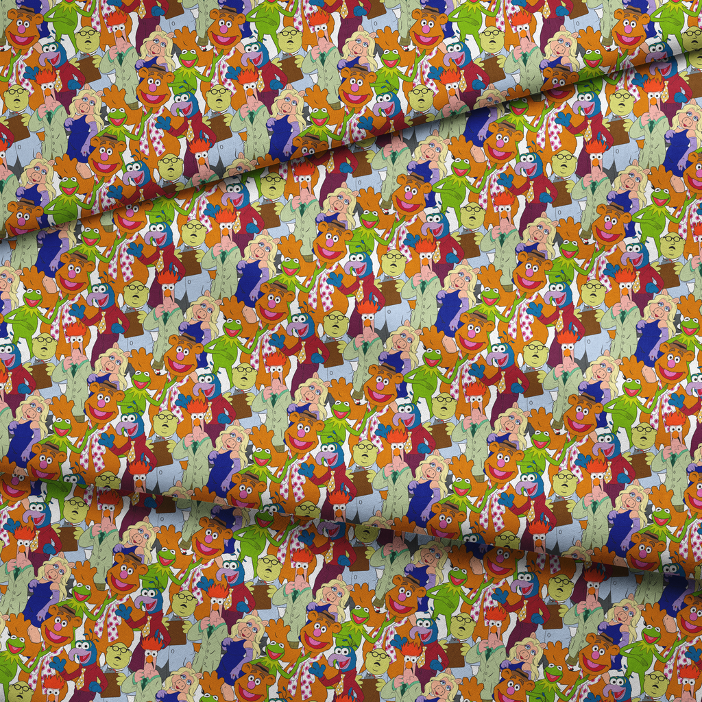 Colorful retro pattern featuring iconic Disney Muppet characters in bright colors. This nostalgic design showcases beloved entertainment figures in a vibrant, playful collage style perfect for fans of classic children's television.