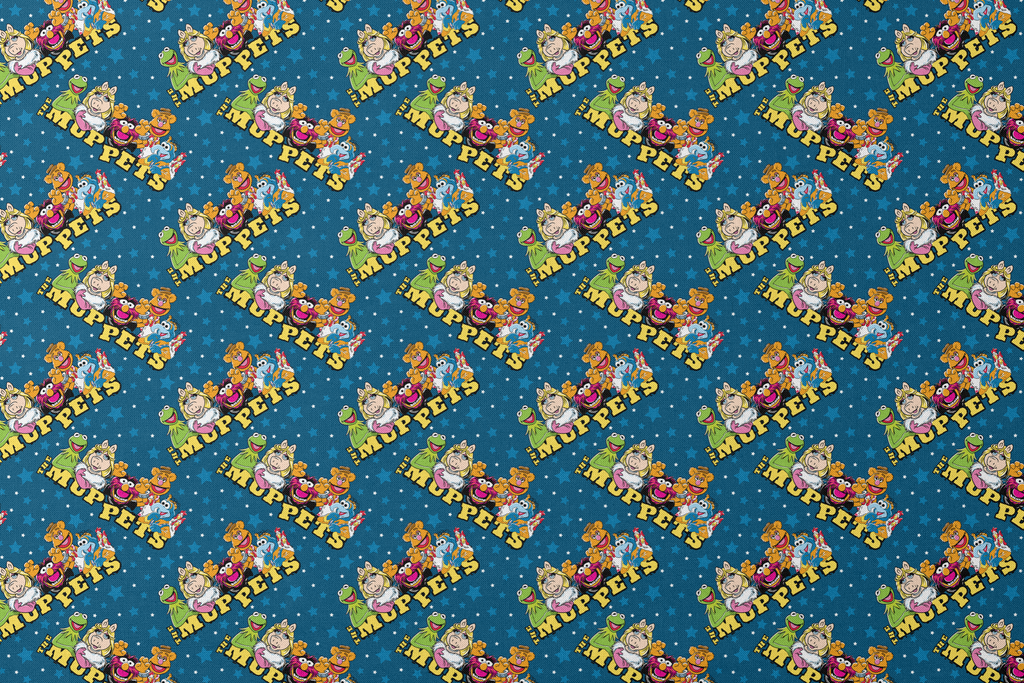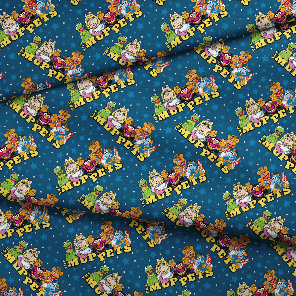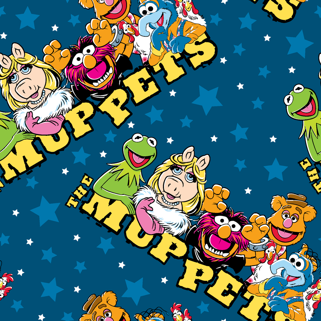 Iconic Disney Muppets characters dance across a starry blue background in this playful retro design featuring Kermit, Miss Piggy, Animal, and the whole beloved gang.