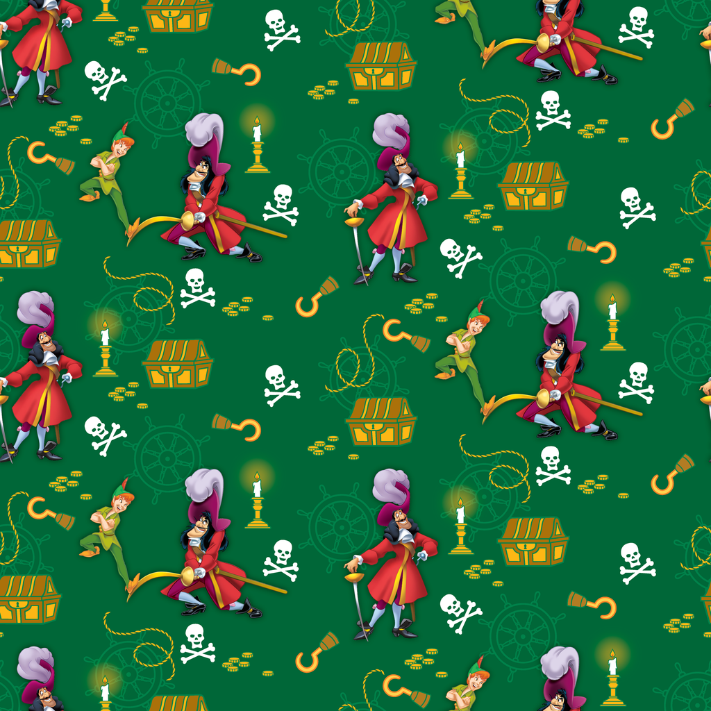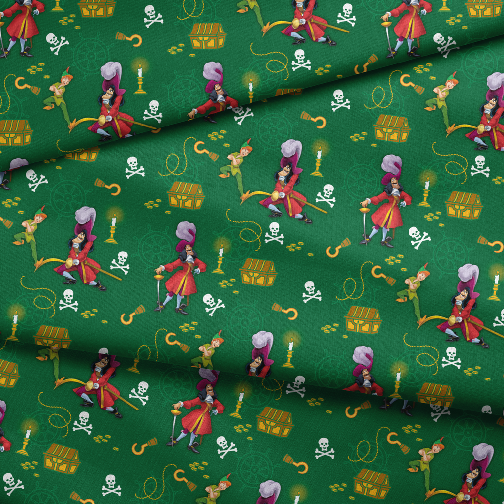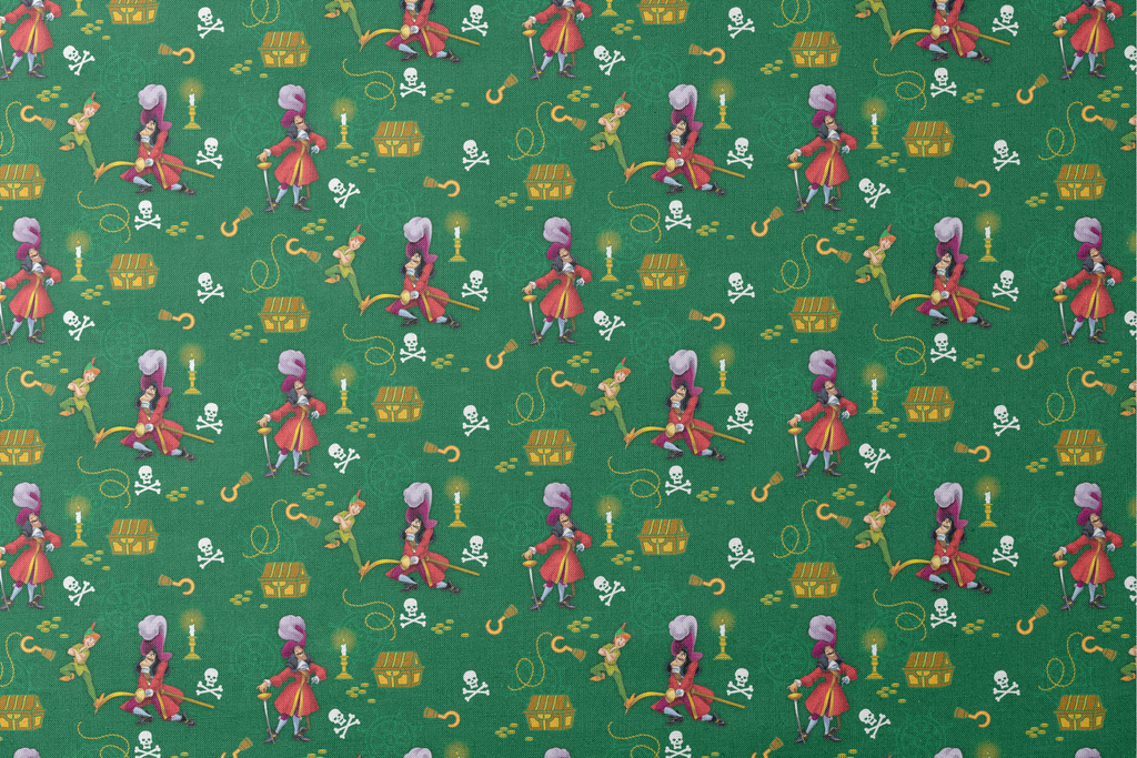 Classic Peter Pan themed pattern with Captain Hook, treasure chests, gold coins, and skull & crossbones on a deep green background. Perfect for nautical and adventure themed decor.