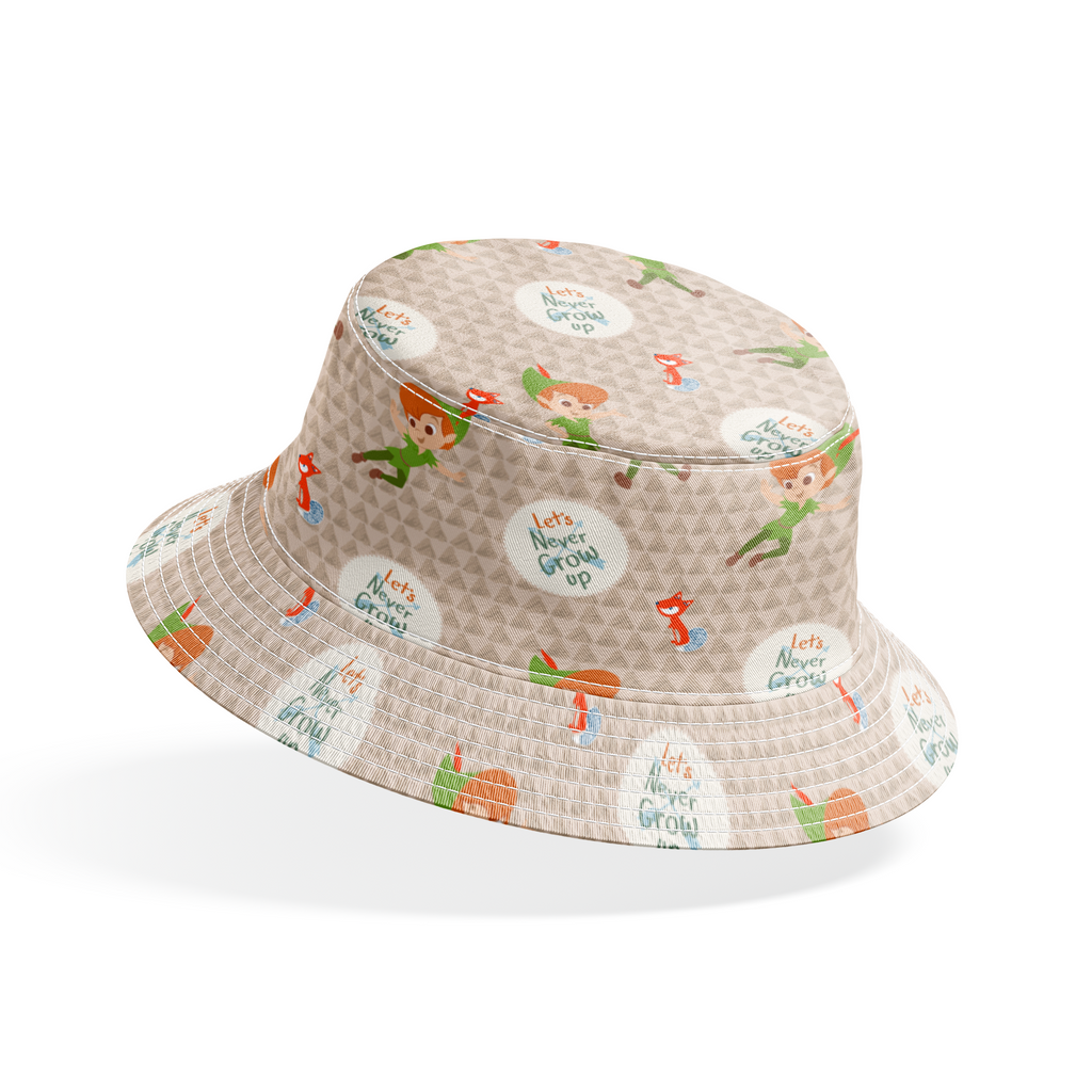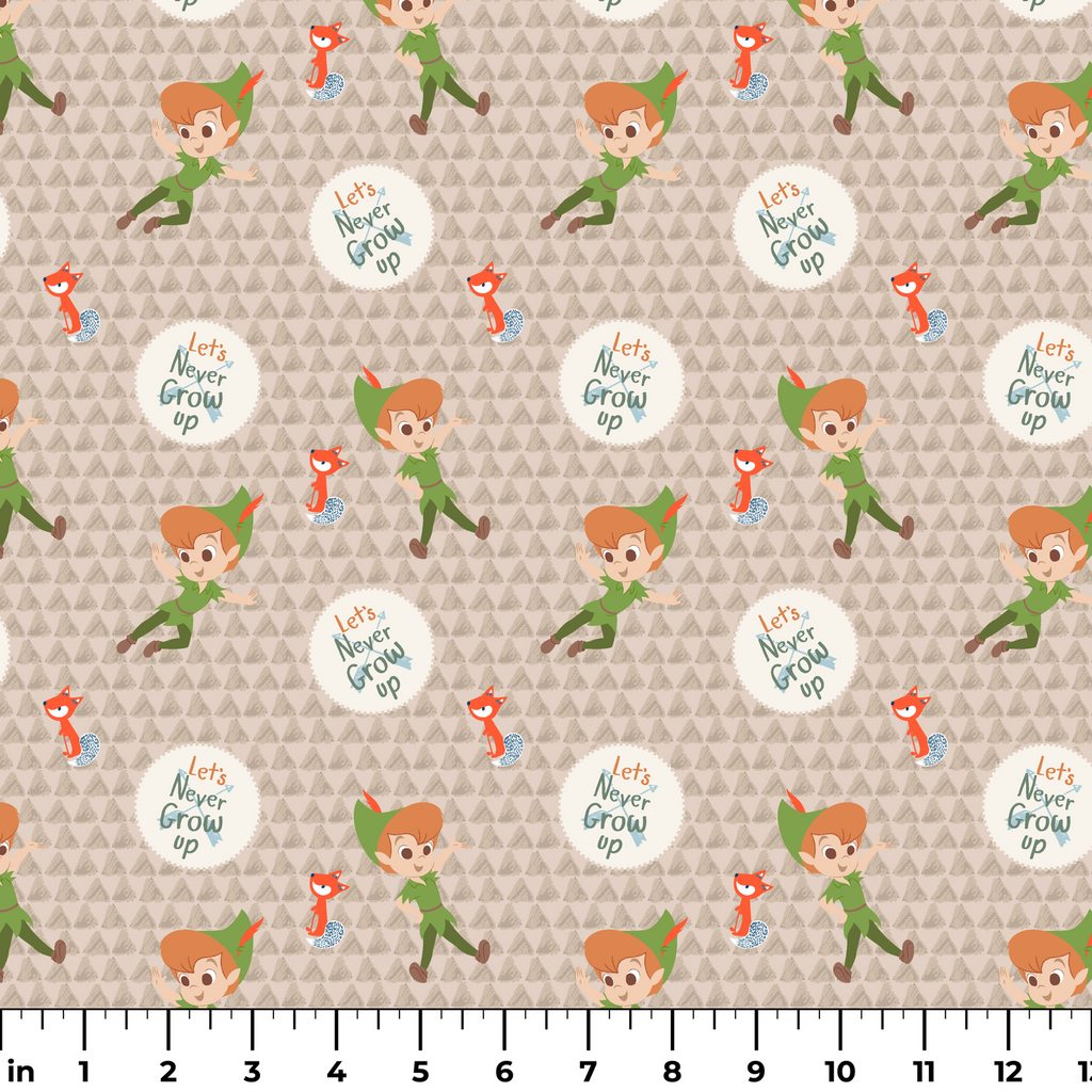 This whimsical Peter Pan themed pattern features the beloved character flying alongside cute fox accents on a beige background, with playful "Let's Never Grow Up" text scattered throughout the design.