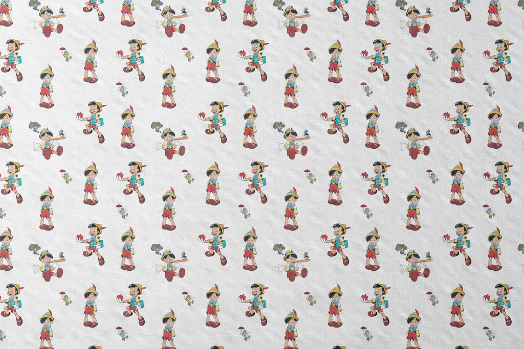 Whimsical Pinocchio pattern featuring the classic wooden puppet character in his iconic outfit with red shorts and pointed hat, perfect for children's decor or Disney-themed crafting projects.