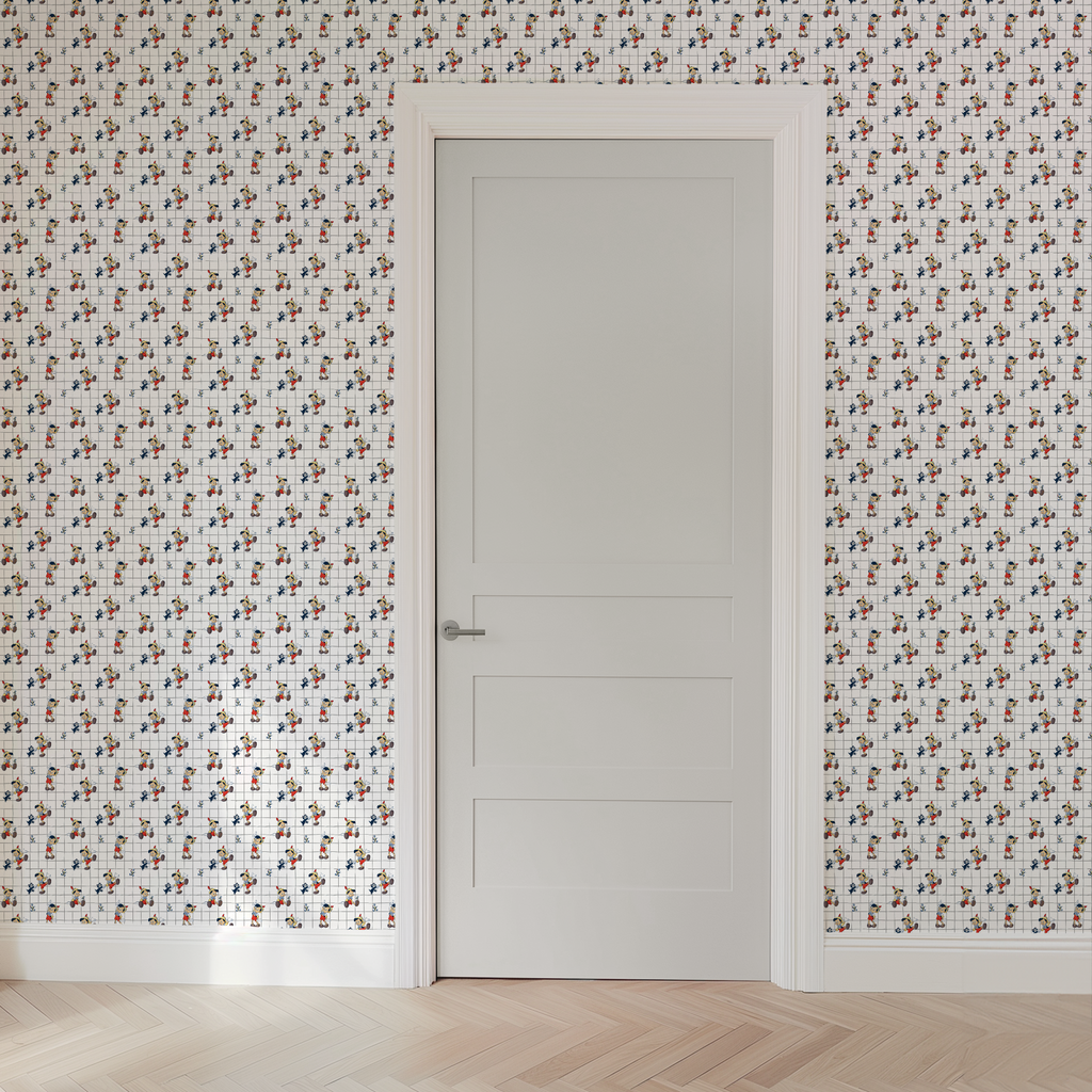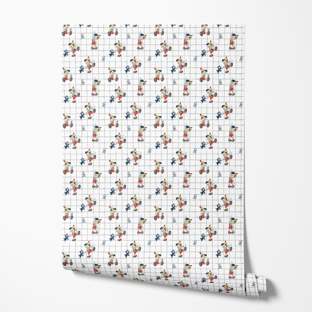 Classic Pinocchio puppets on a grid pattern! Red, blue, and black characters with their feline friend create a playful, nostalgic design perfect for children's apparel or bedroom decor.