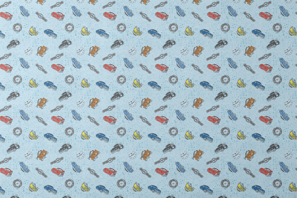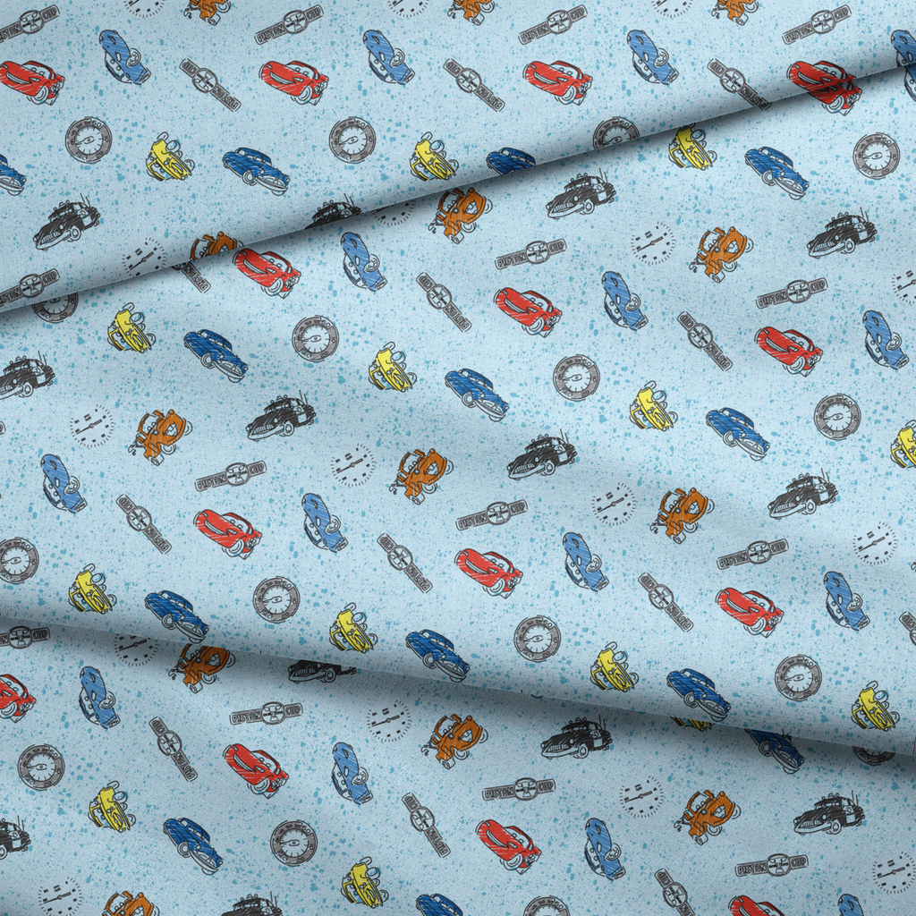 Classic Disney Pixar Cars characters in bright colors on light blue splattered background - perfect for children's crafting or playroom decor.
