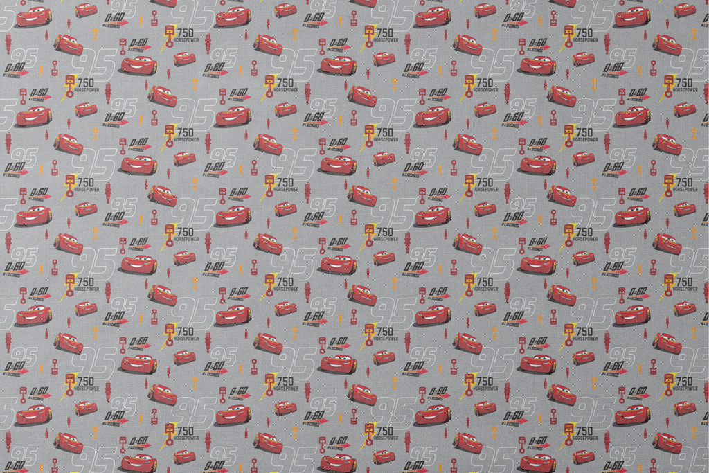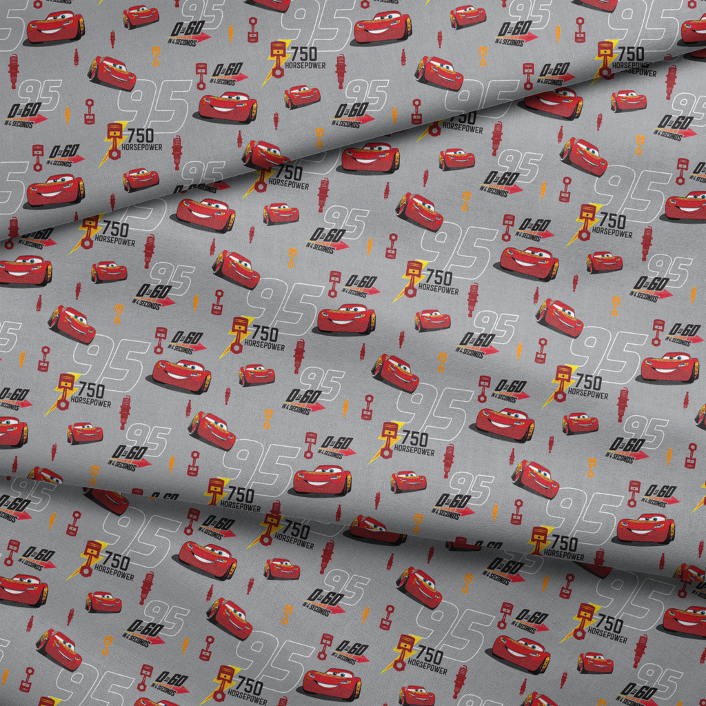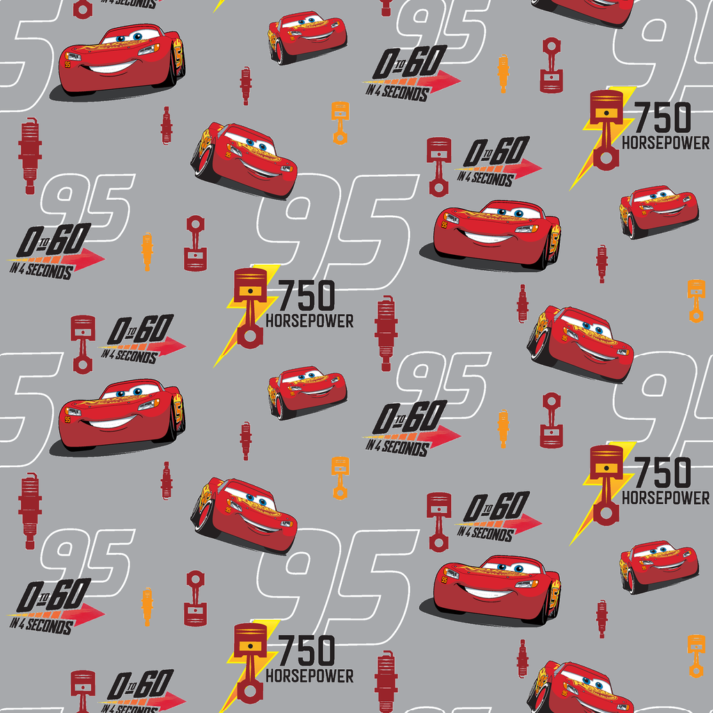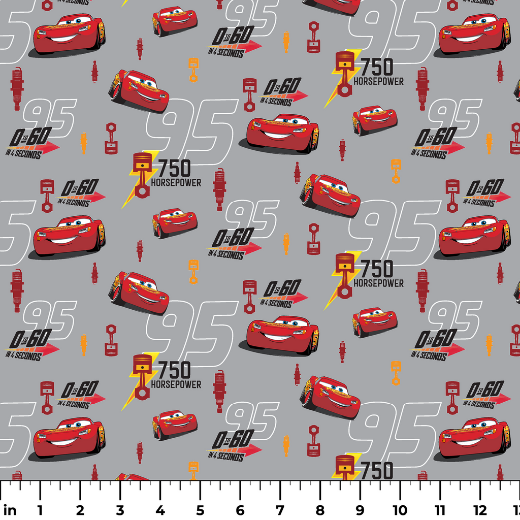 Lightning McQueen zooms across this Disney Pixar Cars-inspired pattern with racing numbers and horsepower indicators on a stylish gray background.