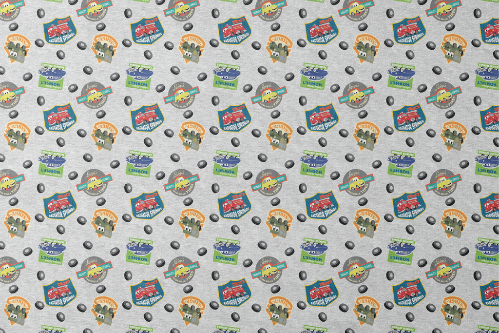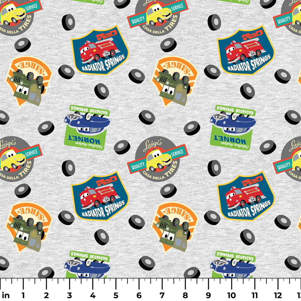 Adorable cartoon car characters from the popular animated Disney movie, Cars with red, olive, and blue vehicles on a gray background scattered with black tire motifs.