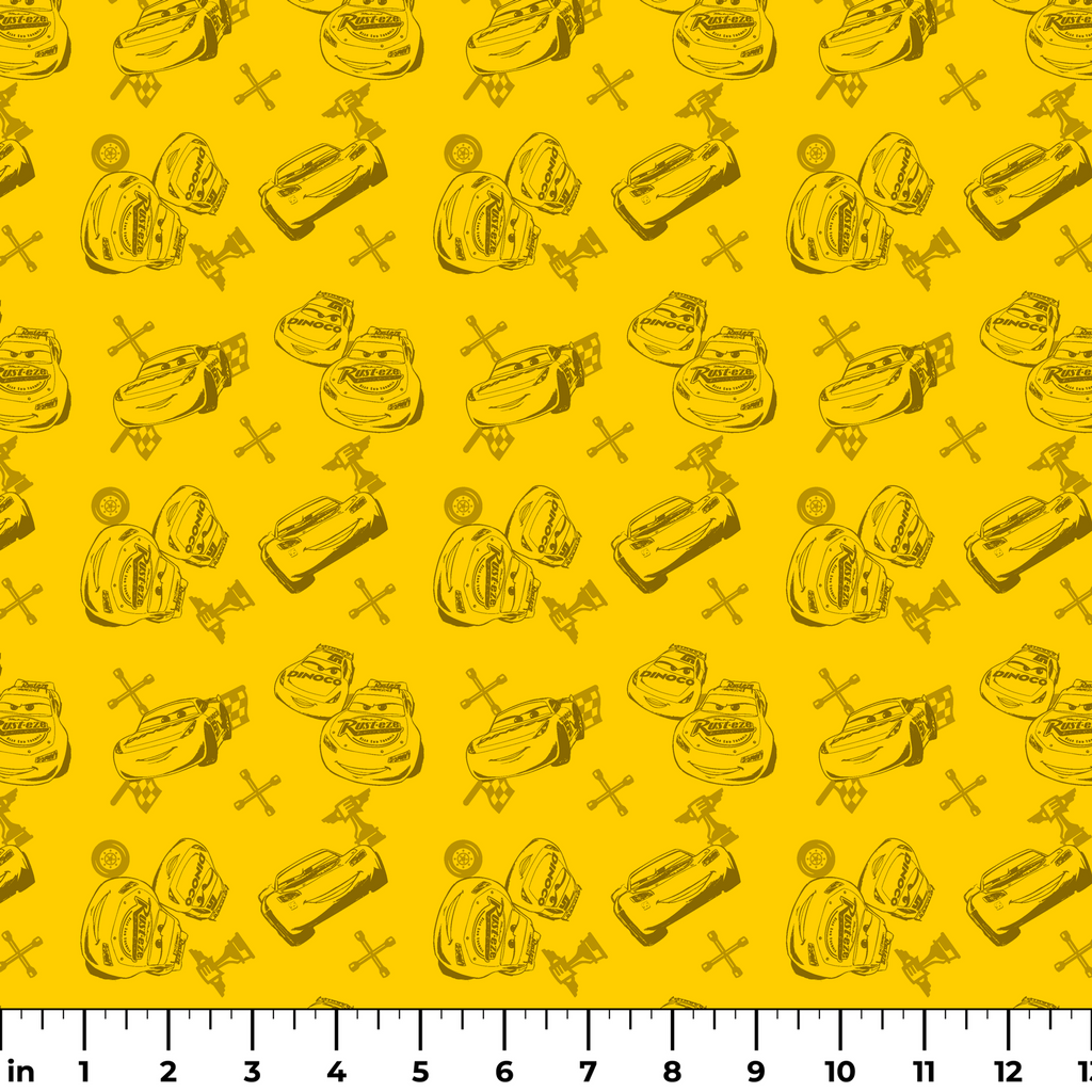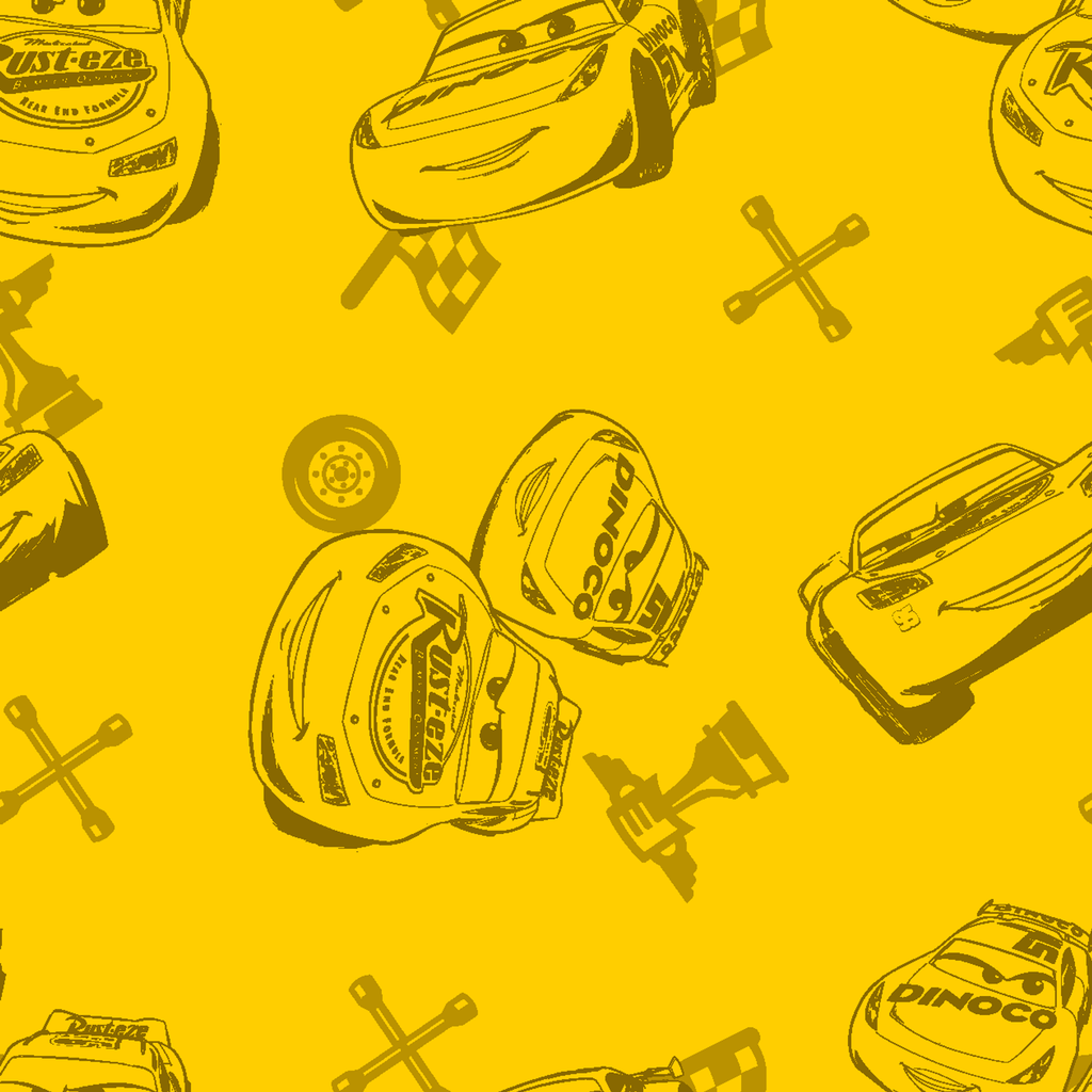 Vibrant Disney-Pixar Cars pattern featuring the cartoon race cars, tires, and tool motifs in a playful, modern design perfect for children's crafting or room decor.