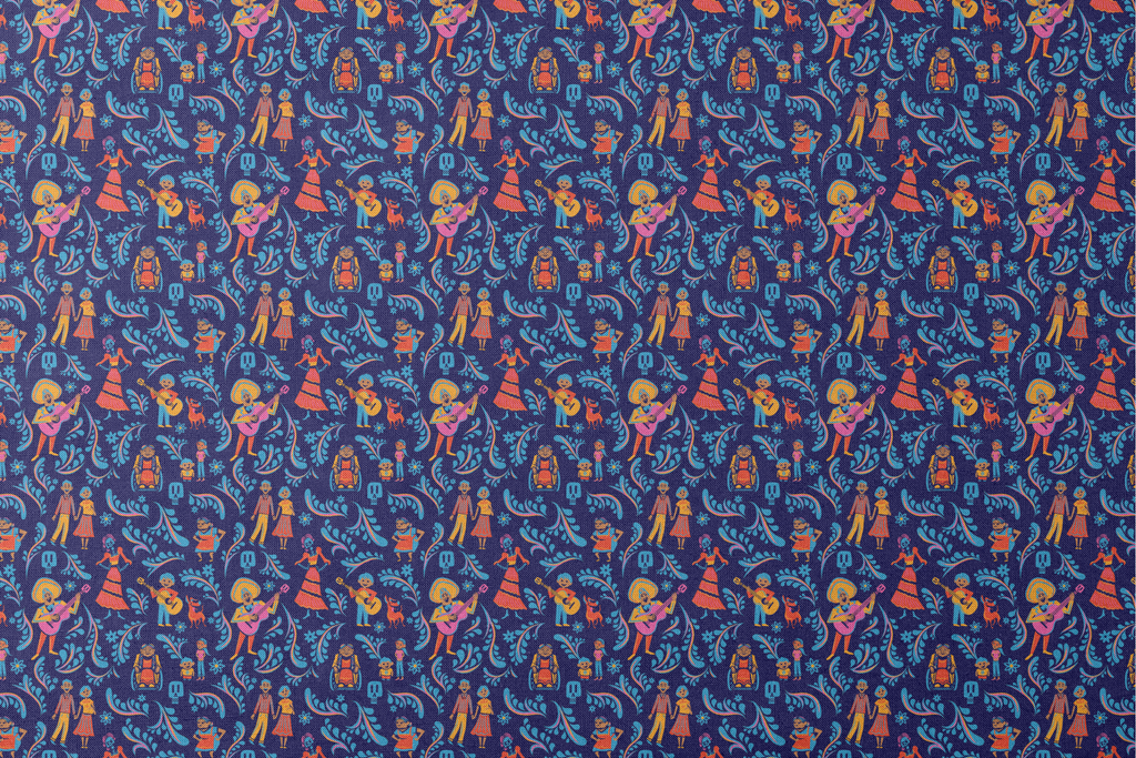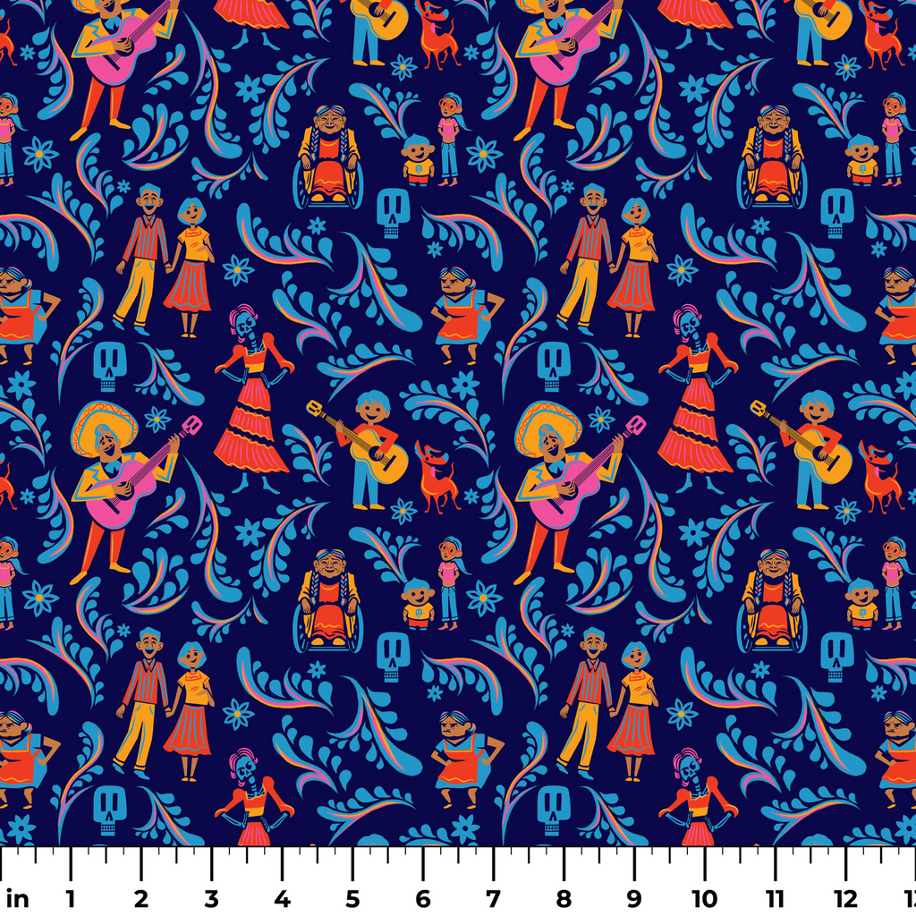 Vibrant Coco Day of the Dead pattern featuring colorful skeletons, musicians, and dancers on a deep blue background with swirling turquoise florals. Perfect for Mexican celebration themed decor.